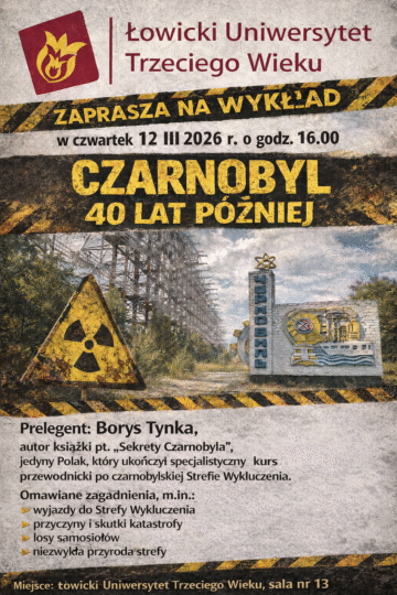 O przyczynach i skutkach katastrofy, bohaterstwie strażaków, pracy likwidatorów i ewakuacji Prypeci, podawaniu płynu Lugola w Polsce i procesach sądowych, o losach samosiołów i niezwykłej przyrodzie w Strefie Wykluczenia, o wyjazdach turystycznych do tej strefy opowiedział na czwartkowym wykładzie 12 III 2026 r. licznie zebranym słuchaczom ŁUTW zaproszony Borys Tynka, autor książki pt. „Sekrety Czarnobyla”.