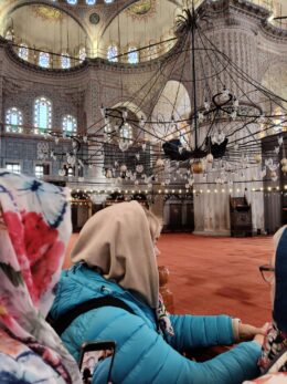 Potem przyszła kolej na zwiedzanie Błękitnego Meczetu. To najwspanialszy przykład tzw. „klasycznego okresu” sztuki islamskiej w Turcji. Wybitne dzieło architektury imperium osmańskiego wpuisane na listę światowego dziedzictwa UNESCO. Jego nazwa pochodzi od ponad 20 000 ręcznie robionych ceramicznych płytek wyrabianych w Izniku (dawniej: Nicea), które zdobią wnętrze i mienią się odcieniami błękitu pod wpływem światła wpadającego przez ponad 200 okien.