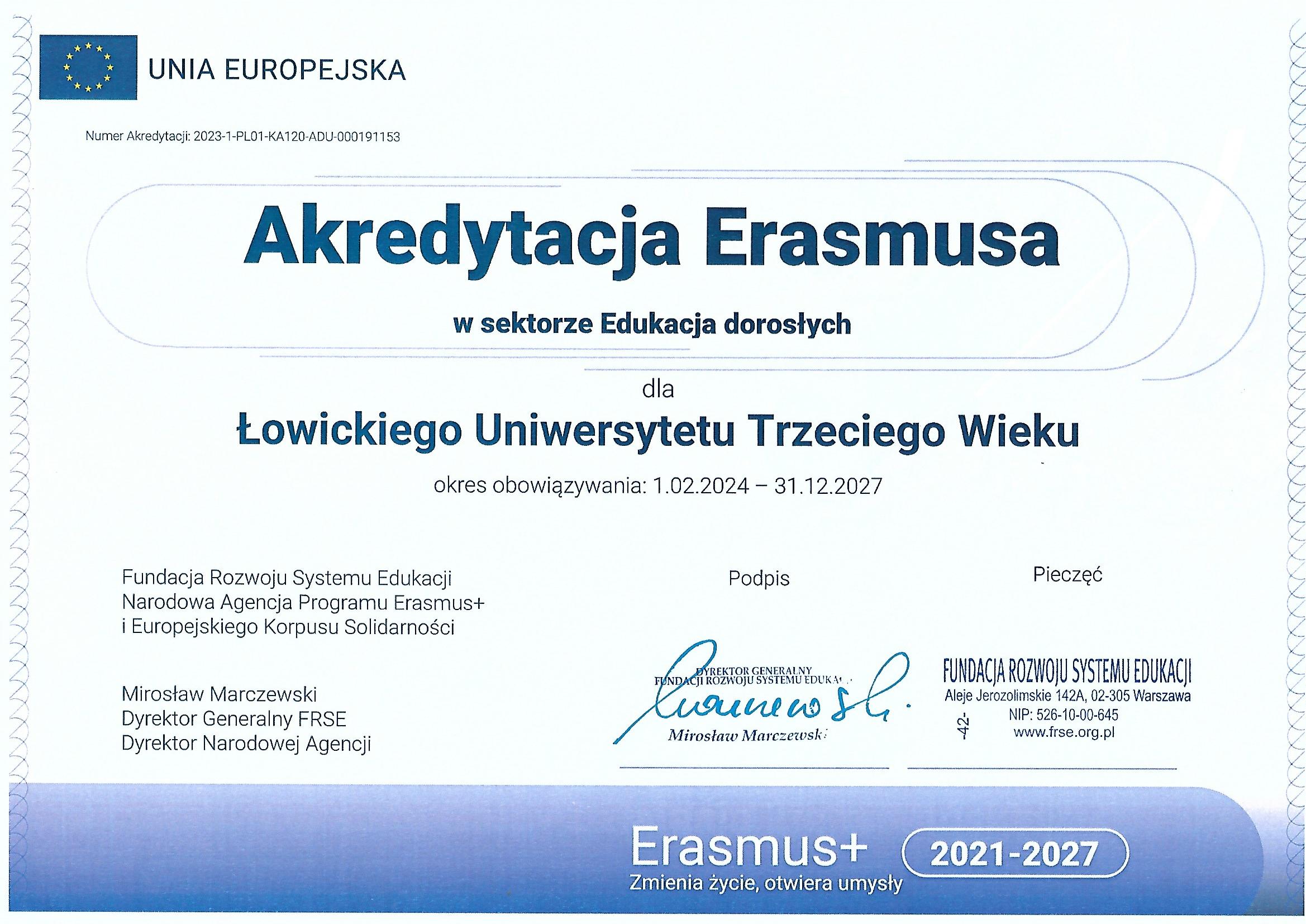 Zarząd Łowickiego Uniwersytetu Trzeciego Wieku z satysfakcją informuje, że 28 VI 2024 r. odebrał oficjalny dokument pn. Akredytacja Erasmusa w sektorze Edukacja dorosłych dla Łowickiego Uniwersytetu Trzeciego Wieku, okres obowiązywania: 1 II 2024 r.– 31 XII 2027 r. Nr Akredytacji: 2023-1-PL01-KA120-ADU-000191153. Całkowita kwota dofinansowania to 95 830 EUR.