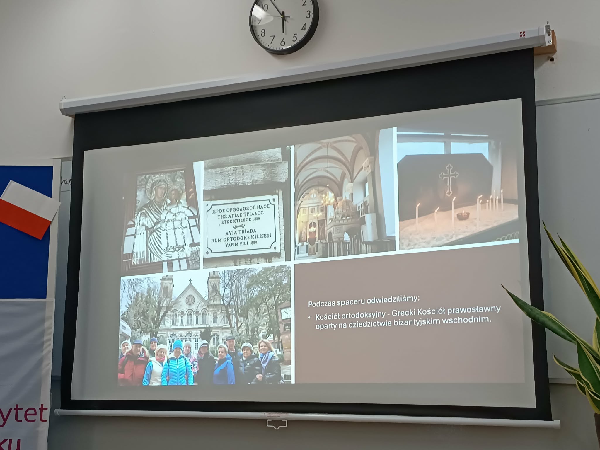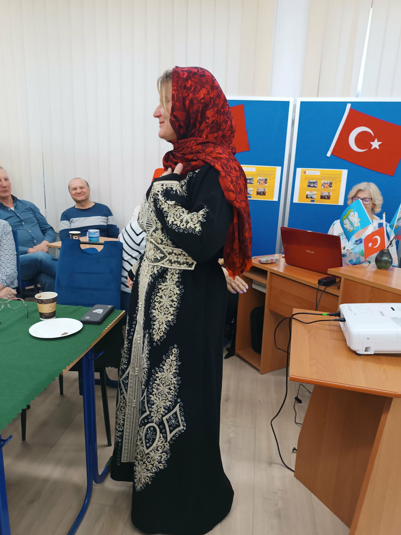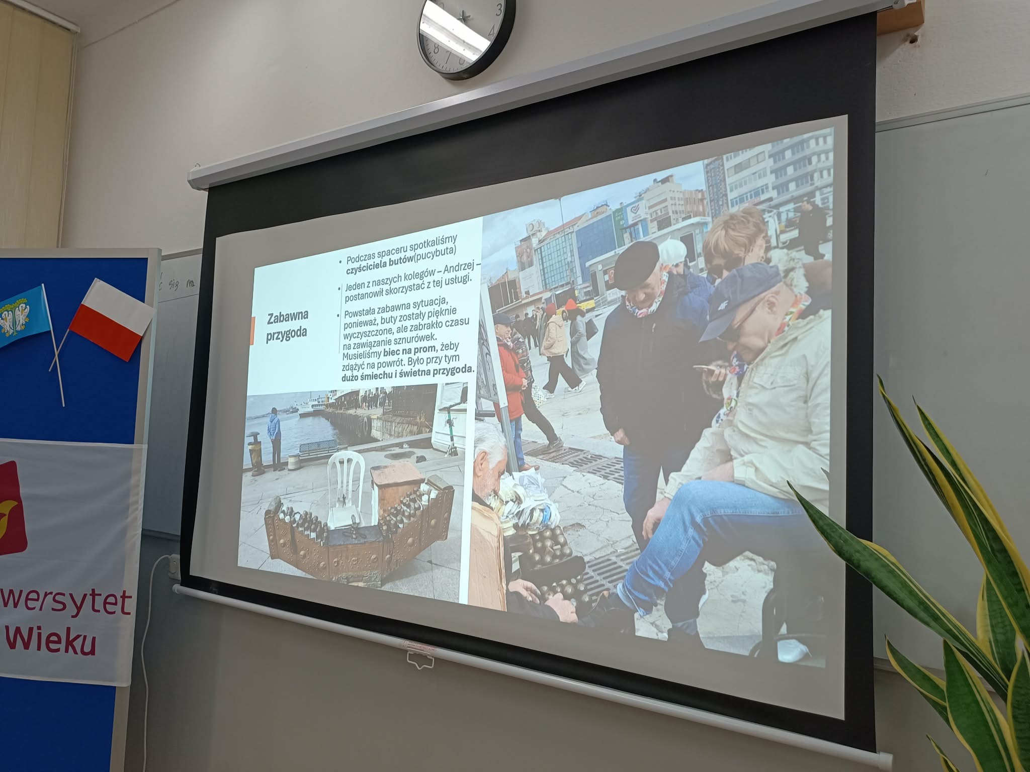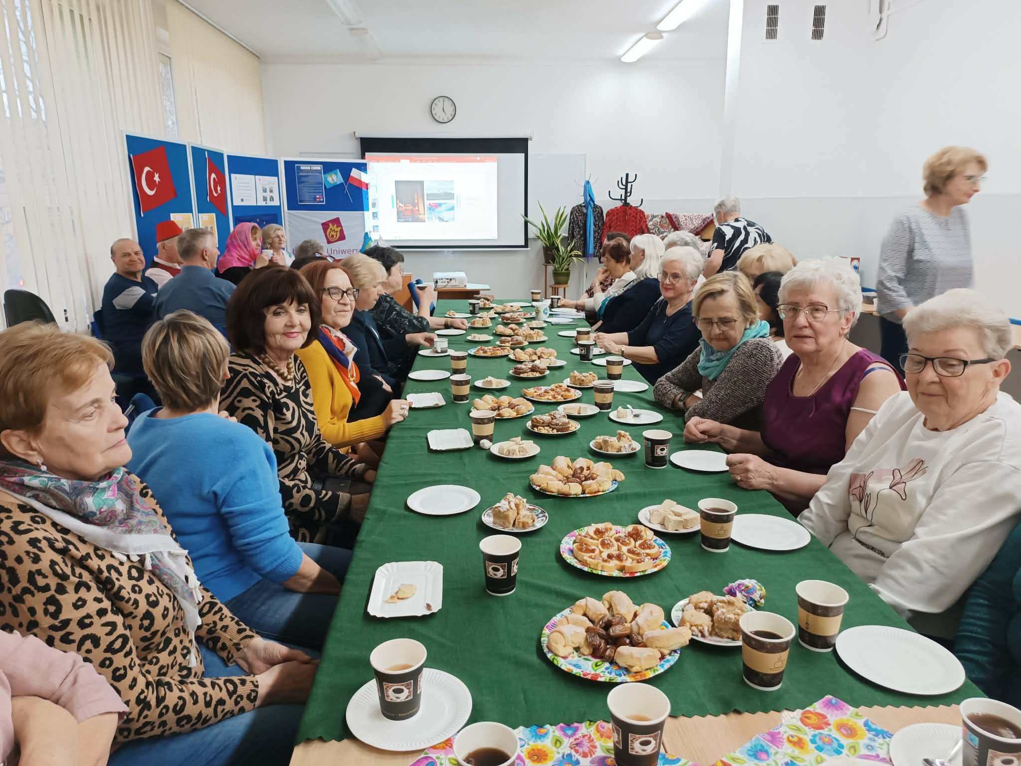 Przygotowana relacja dotyczyła wyjazdu w dniach 22-28 II 2026 r. do Stambułu w Turcji 10-osobowej grupy słuchaczy pod opieką Joanny Gałki-Walczykiewicz. Ważne, że przygotowali ją sami uczestnicy pod kierunkiem Ireny Kolos, doskonaląc swoje umiejętności informatyczne. Współpraca grupowa wypadła też znakomicie pod kątem przygotowania sali i słodkiego poczęstunku dla wszystkich przybyłych. Nie zabrakło na stole oryginalnych tureckich przysmaków, przy stołach… ucharakteryzowanych w tureckie stroje słuchaczy, a na wystawce - zakupów wprost z tureckich bazarów.
