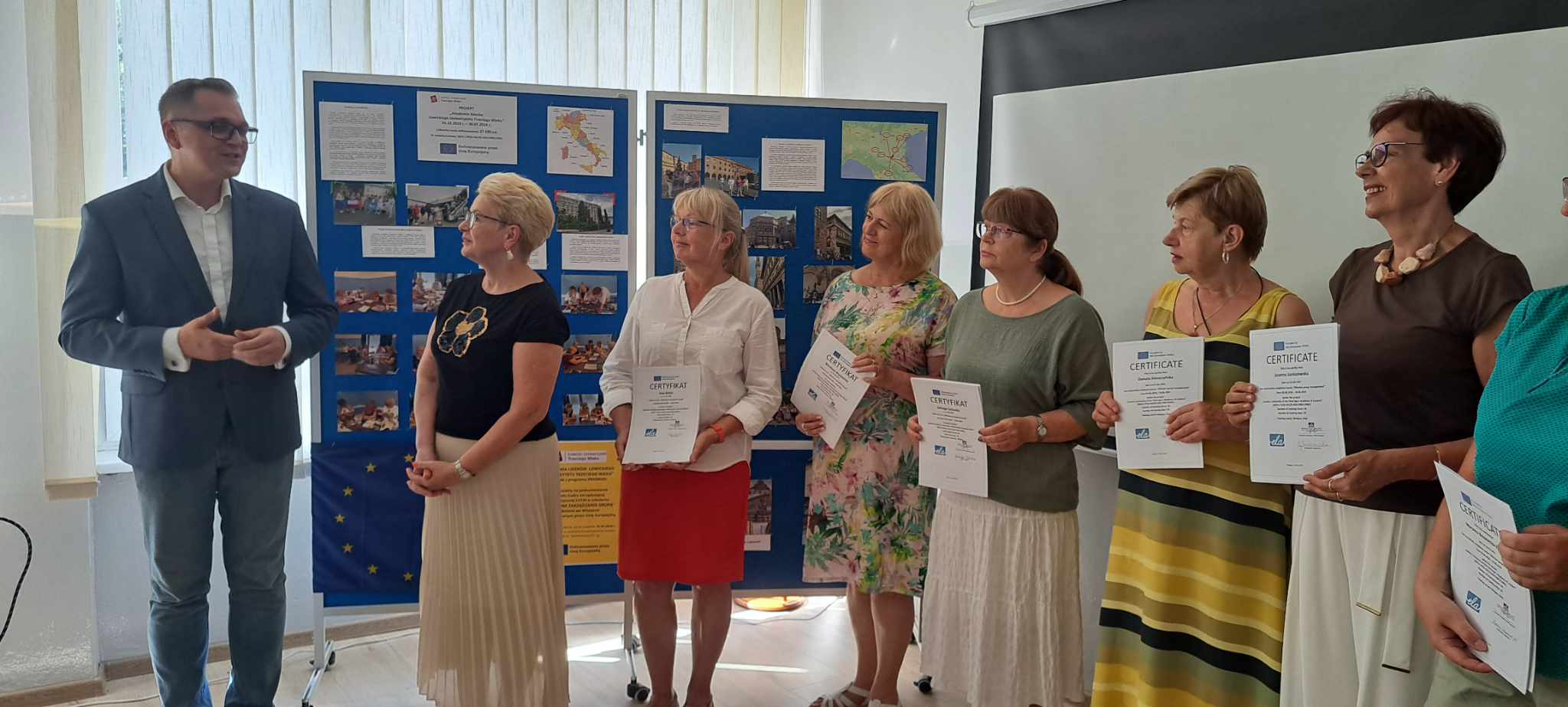 Uczestniczki wyjazdu poczuły się szczególnie wyróżnione, bo z rąk burmistrza Mariusza Siewiery najpierw odebrały certyfikaty uczestnictwa w szkoleniu wydane przez organizację goszczącą, czyli Erasmus Learning Academy z Bolonii oraz najważniejszy dokument – Europass-Mobilność potwierdzający udział w Europejskiej Ścieżce Kształcenia w ramach programu wspólnotowego Erasmus+ Edukacja Dorosłych. W edukacyjnej wyprawie do Bolonii udział wzięły: Ewa Białas, Wiesława Bryszewska, Jadwiga Cichocka, Danuta Daszczyńska Joanna Janiszewska, Marzena Kozanecka-Zwierz, Helena Mika, Renata Schilling, Anna Siekierska, Anna Taszycka-Kowalczyk.