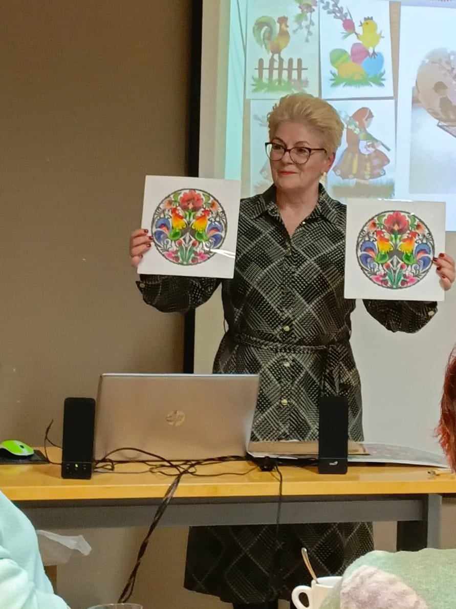 Prezes Krystyna Kucharska wręczyła przywiezione z Polski prezenty: piękne wycinanki od twórczyń ludowych, kartki świąteczne wykonane przez łowickie seniorki na warsztatach rękodzieła oraz wiele regionalnych pamiątek podarowanych przez Burmistrza Miasta Łowicza Mariusza Siewierę.
