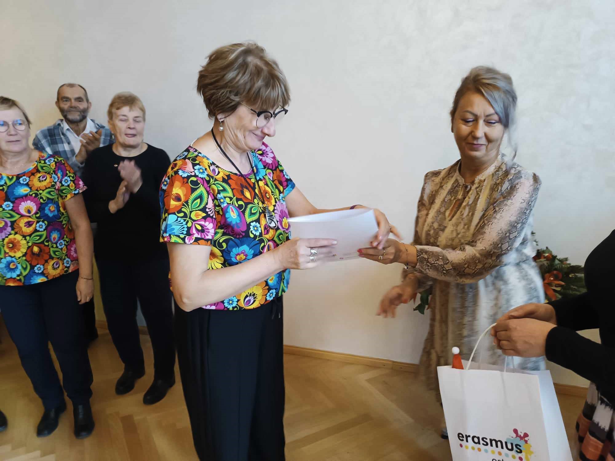 Zwieńczeniem spotkania było wręczenie certyfikatów dla wszystkich uczestników grupowej mobilności z akredytowanego projektu o numerze 2024-1-PL01-KA121-ADU- 000208768 dofinansowanego przez Unię Europejską. Dokonały tego panie Sarka Zubkowa oraz Wioletta Marciniak – przedstawicielka organizacji przyjmującej, która opiekowała się seniorami z Łowicza.