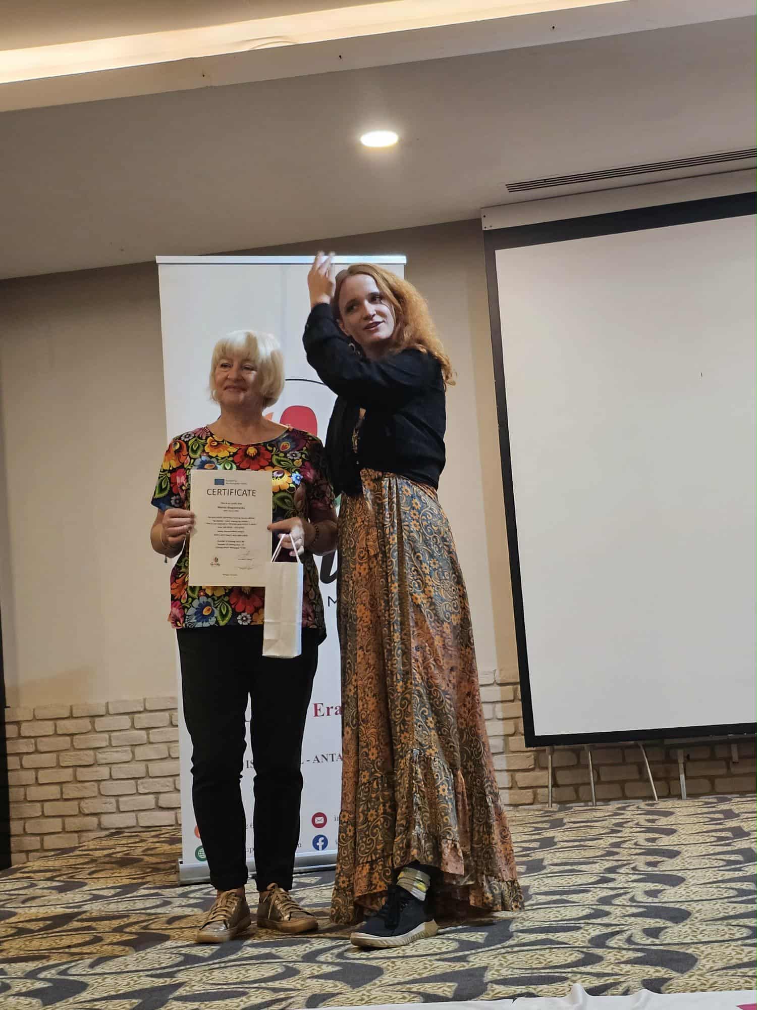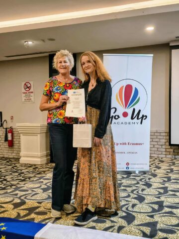 Ich trenerka Olha Leshchyk zadbała o to, by wręczenie tych certyfikatów wystawionych przez organizację partnerską pn. GO UP ACADEMY w dn. 3 XII, odbyło się w uroczystej oprawie. Podziękowała im za aktywny udział w kursie i pozytywną energię. Każdy z uczestników szkolenia otrzymał, oprócz dokumentu potwierdzającego ukończenie międzynarodowego kursu, symboliczny turecki upominek.