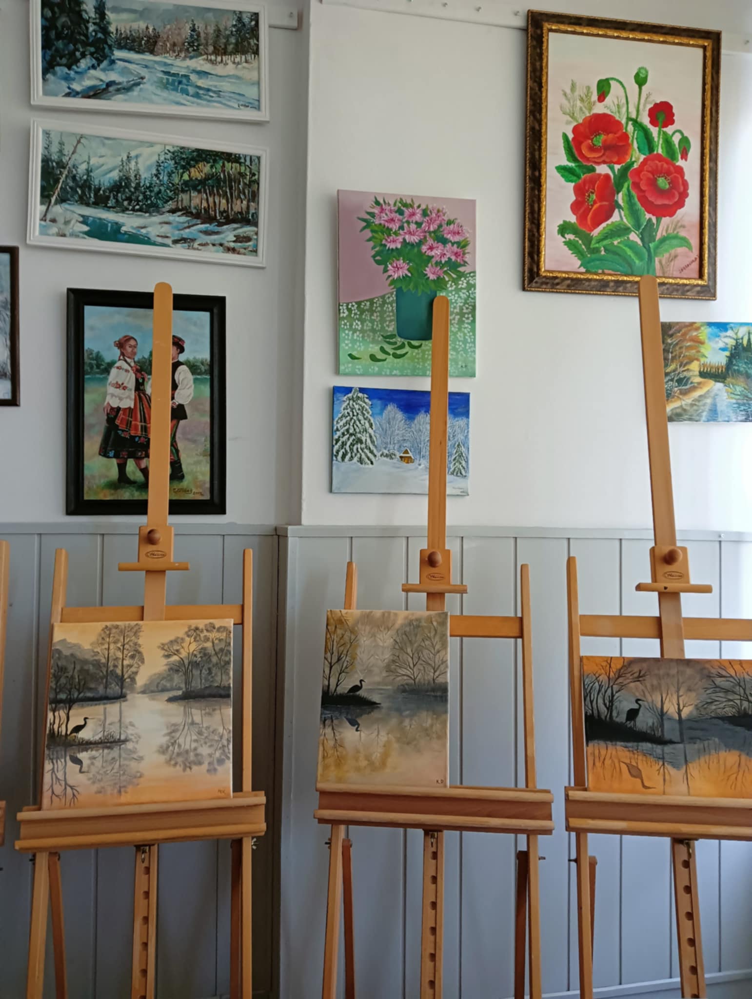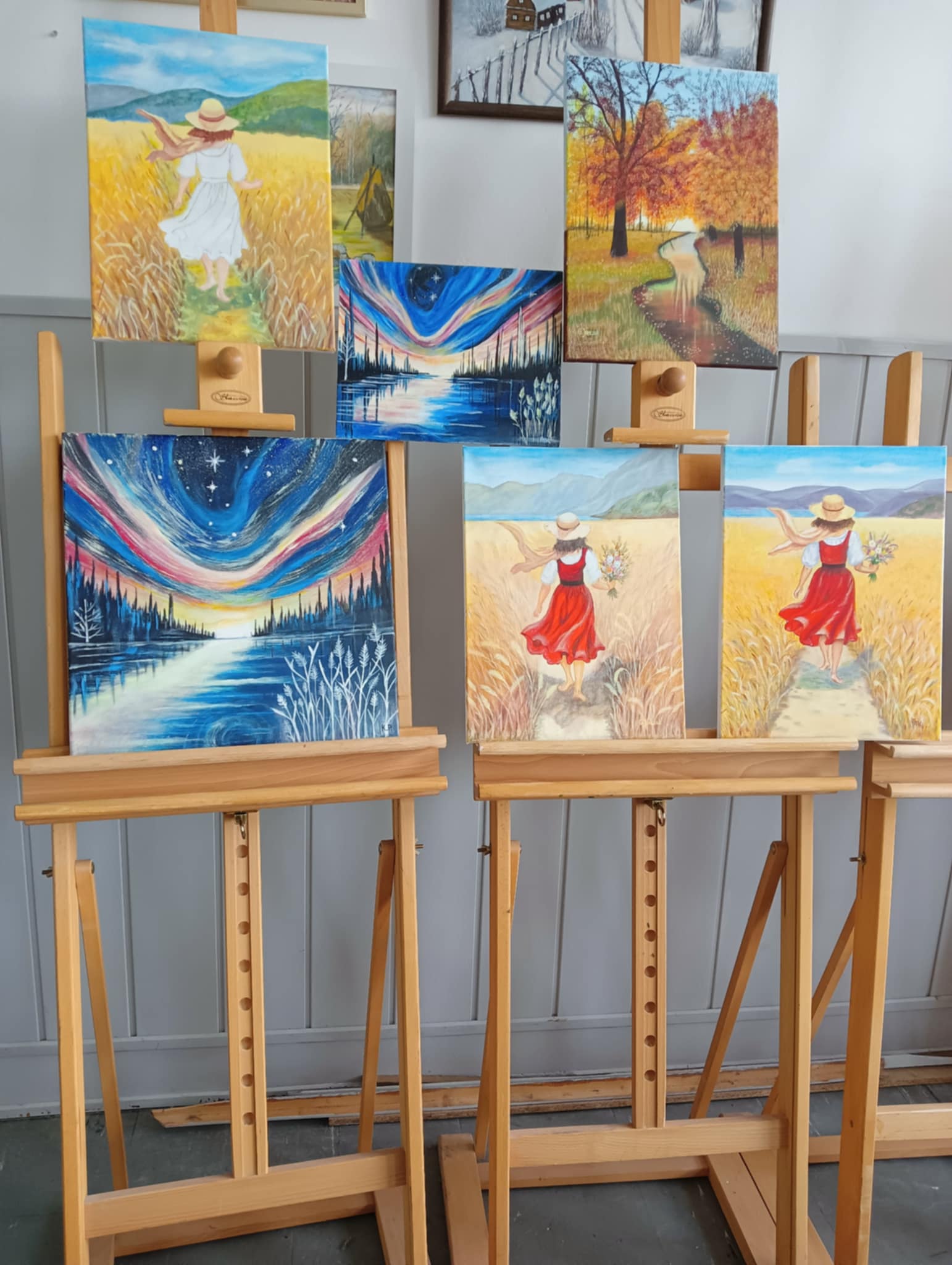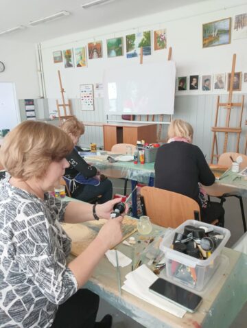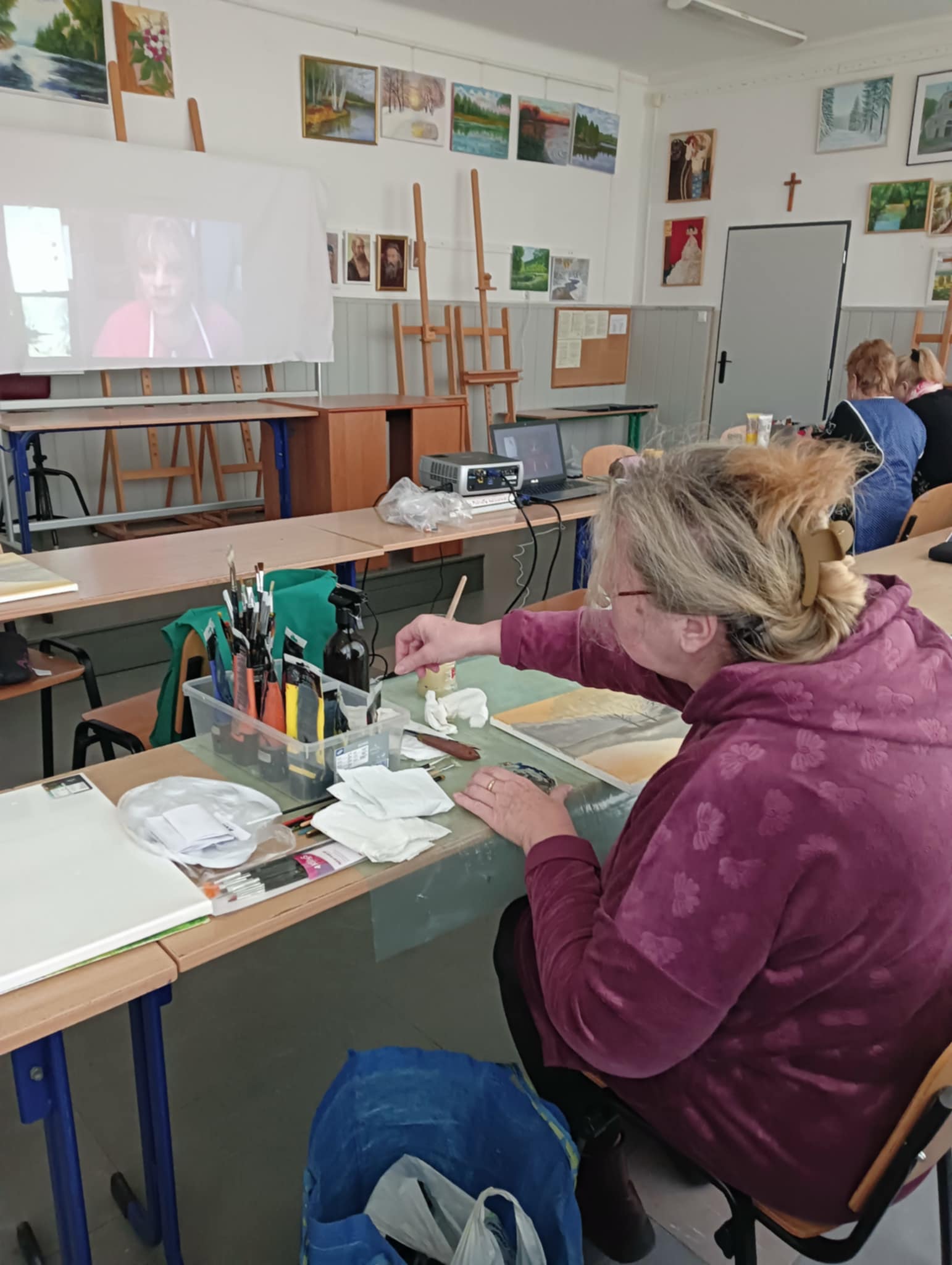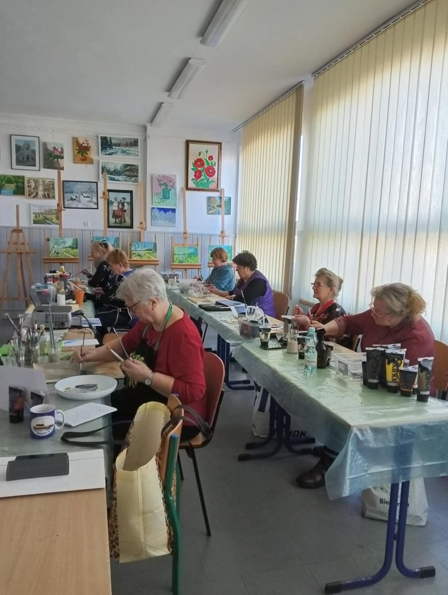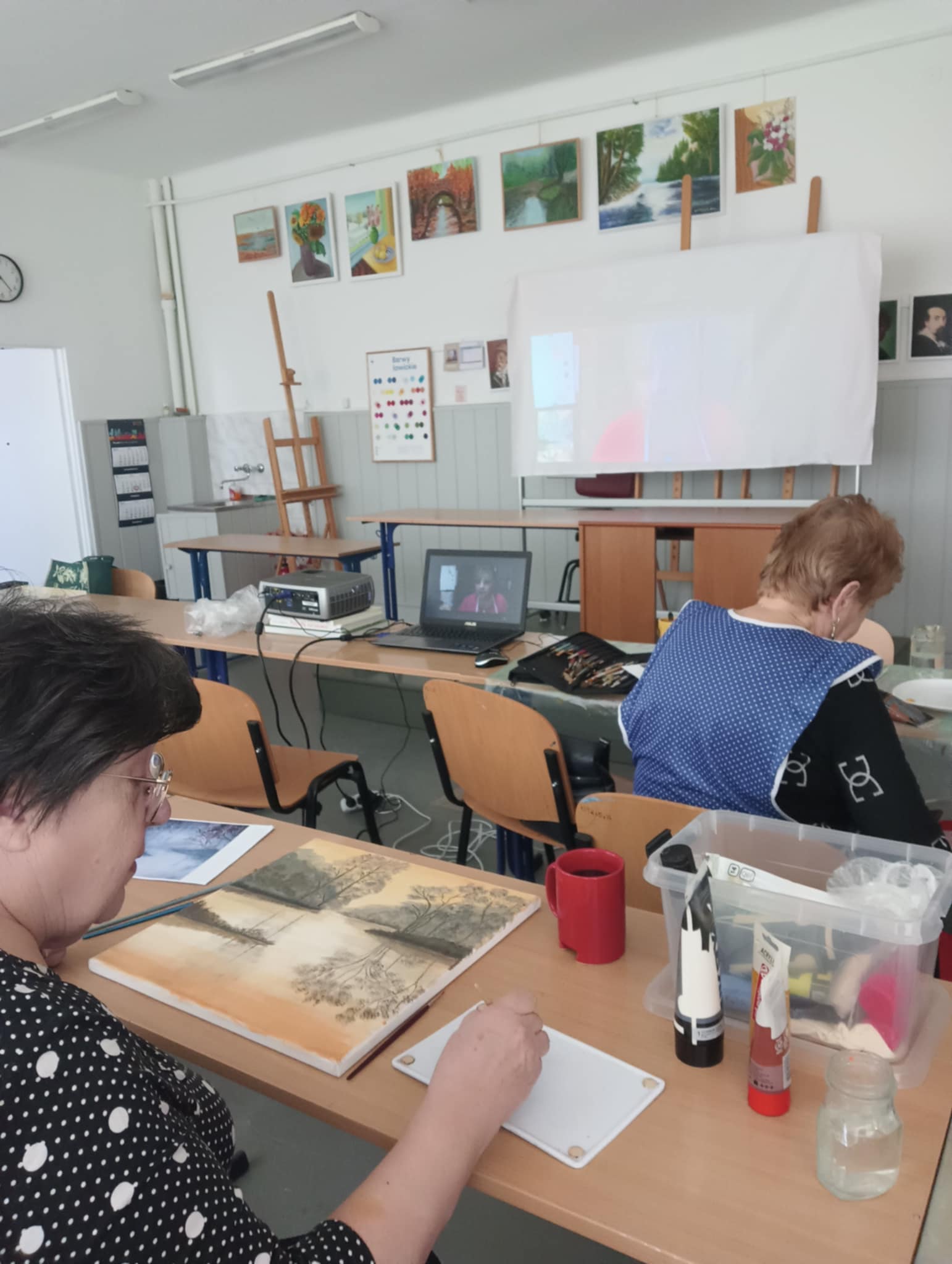 We wtorek 17 VI 2025 r. spotkały się w pracowni plastycznej po raz ostatni, podsumowały to, czego dokonały samodzielnie od lutego br., kiedy to stały się kołem samokształceniowym. Ich zajęcia były multimedialne, bo korzystały z dostępnych w internecie programów wspierających naukę malowania. Z bogatej oferty wspólnie wybierały tematy prac, które chciały malować. Była więc „Jesień”, „Zorza nad jeziorem”, „Brzozy”, „Zamglone jezioro z czaplą” i „Dziewczyna w zbożu”.
