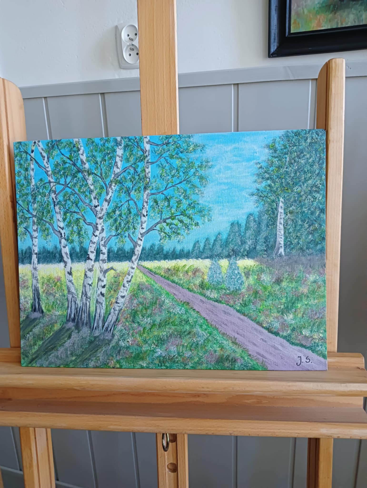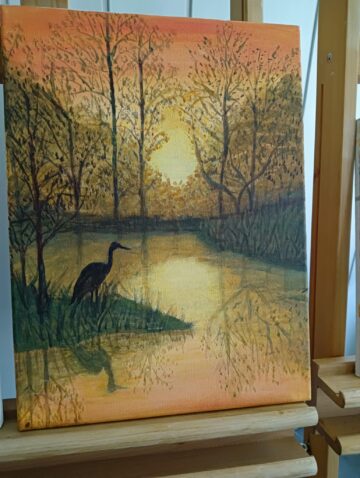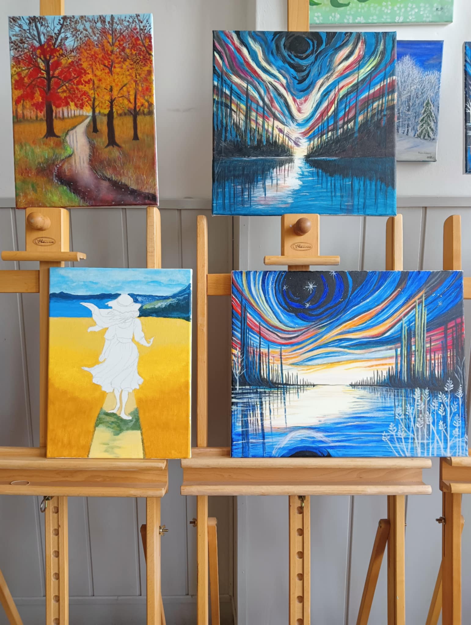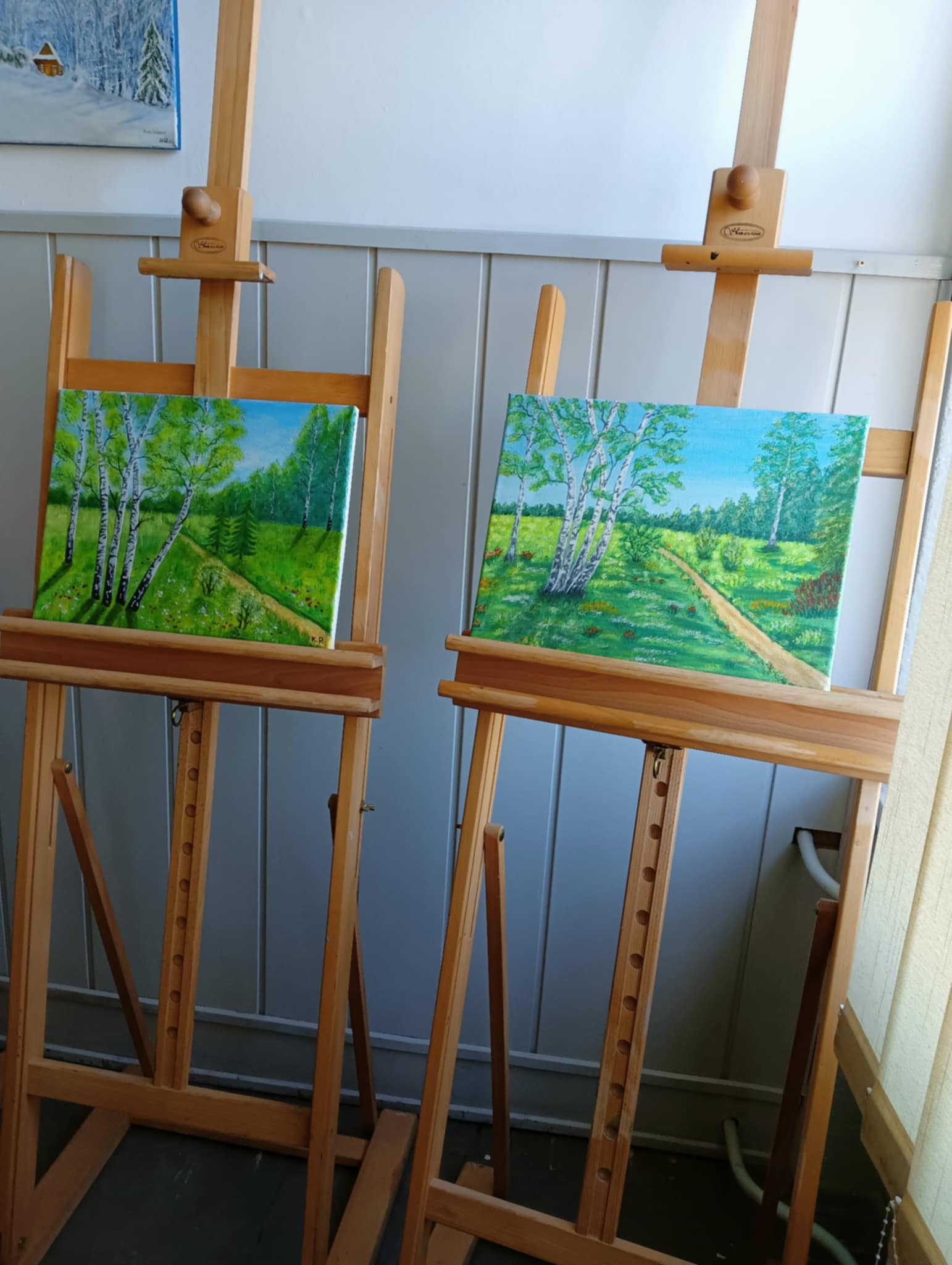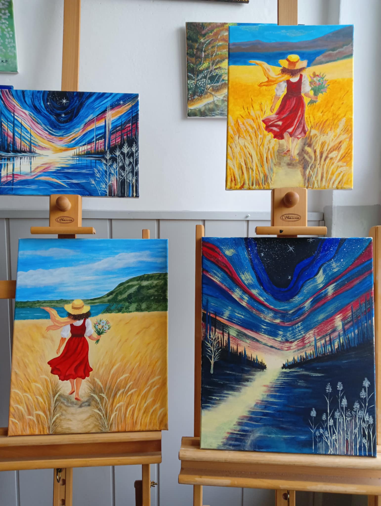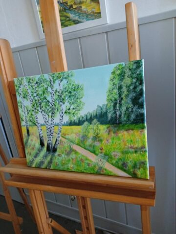 We wtorek 17 VI 2025 r. spotkały się w pracowni plastycznej po raz ostatni, podsumowały to, czego dokonały samodzielnie od lutego br., kiedy to stały się kołem samokształceniowym. Ich zajęcia były multimedialne, bo korzystały z dostępnych w internecie programów wspierających naukę malowania. Z bogatej oferty wspólnie wybierały tematy prac, które chciały malować. Była więc „Jesień”, „Zorza nad jeziorem”, „Brzozy”, „Zamglone jezioro z czaplą” i „Dziewczyna w zbożu”.