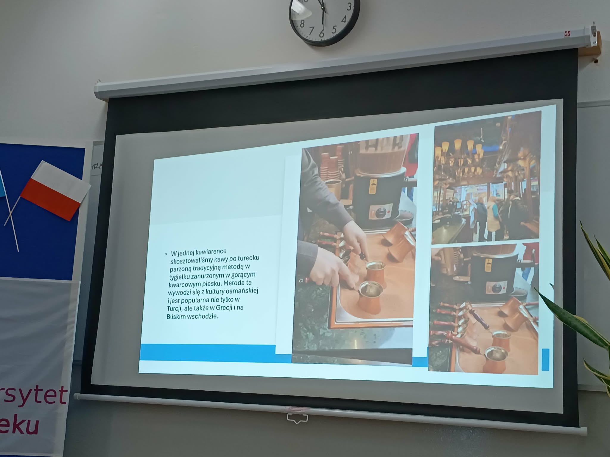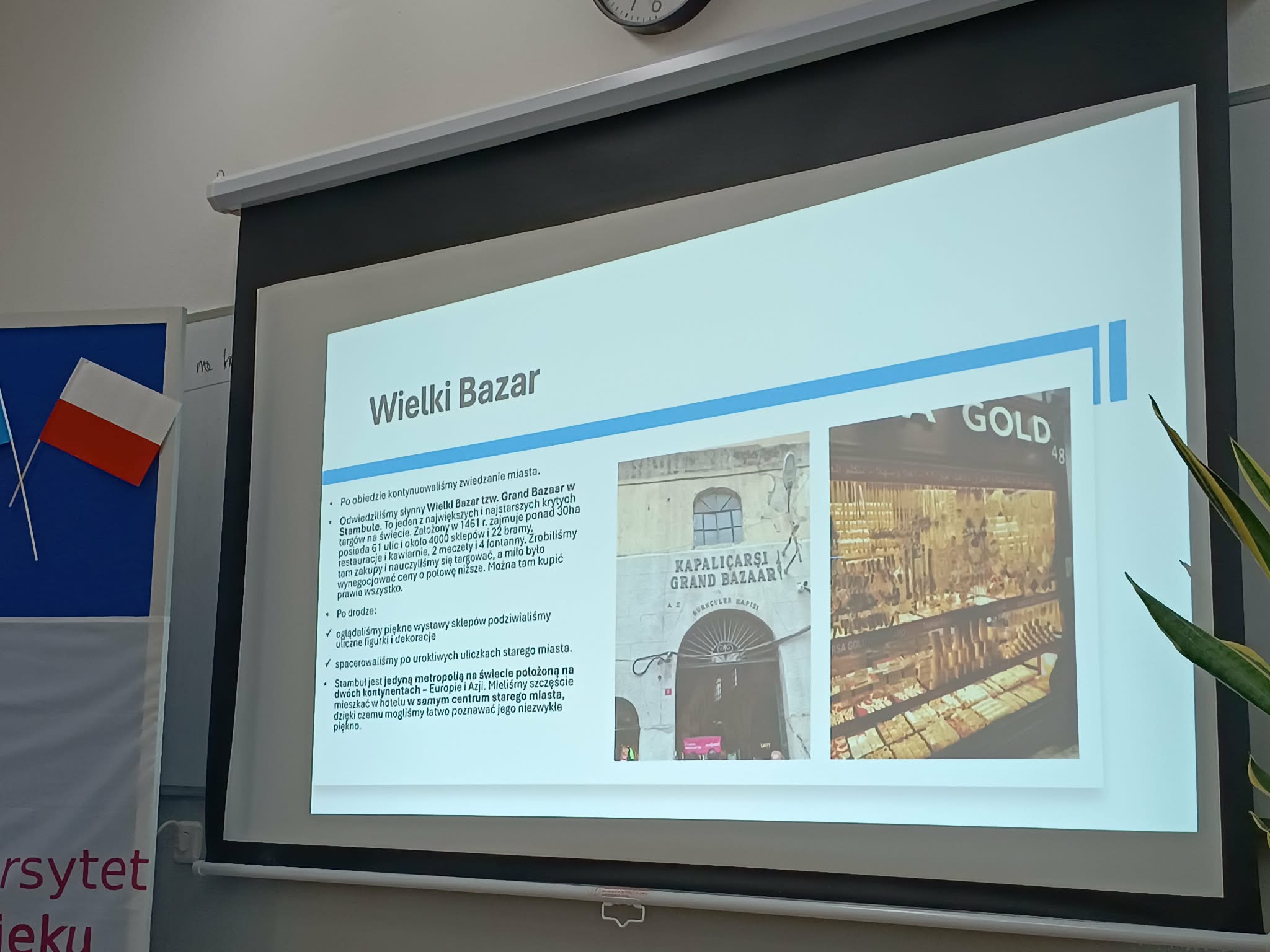 Przygotowana relacja dotyczyła wyjazdu w dniach 22-28 II 2026 r. do Stambułu w Turcji 10-osobowej grupy słuchaczy pod opieką Joanny Gałki-Walczykiewicz. Ważne, że przygotowali ją sami uczestnicy pod kierunkiem Ireny Kolos, doskonaląc swoje umiejętności informatyczne. Współpraca grupowa wypadła też znakomicie pod kątem przygotowania sali i słodkiego poczęstunku dla wszystkich przybyłych. Nie zabrakło na stole oryginalnych tureckich przysmaków, przy stołach… ucharakteryzowanych w tureckie stroje słuchaczy, a na wystawce - zakupów wprost z tureckich bazarów.