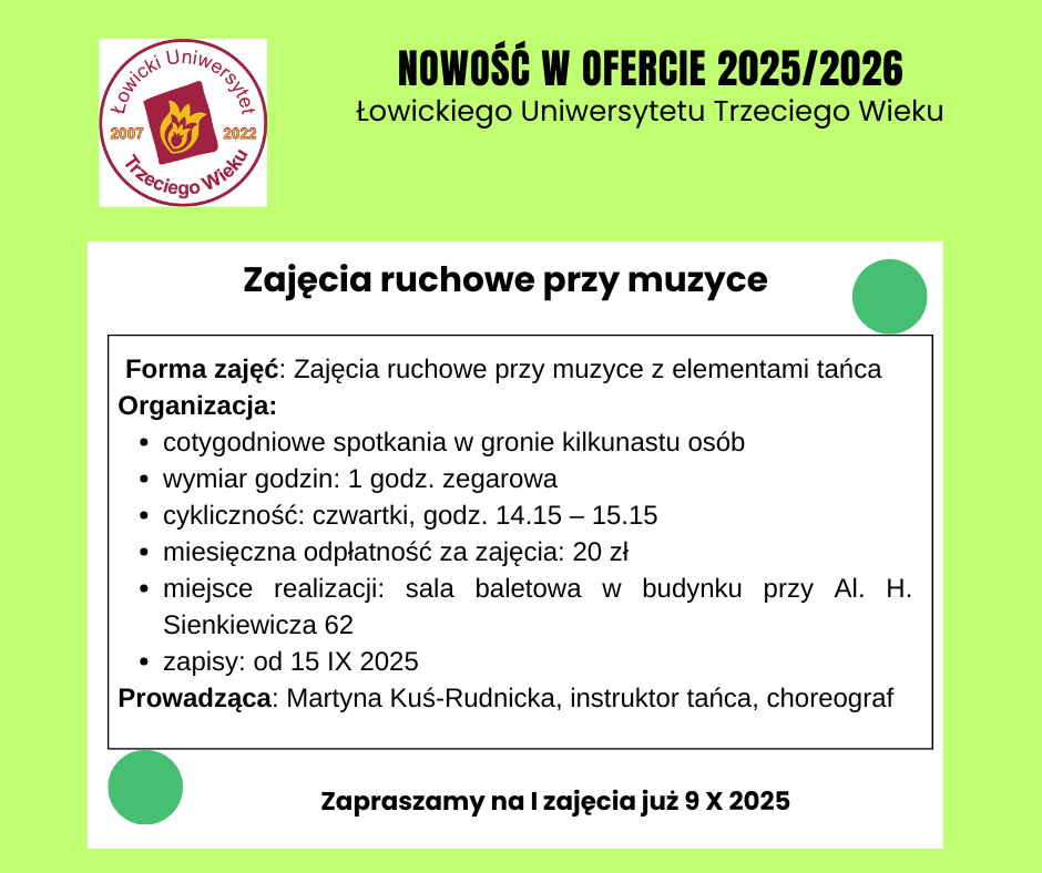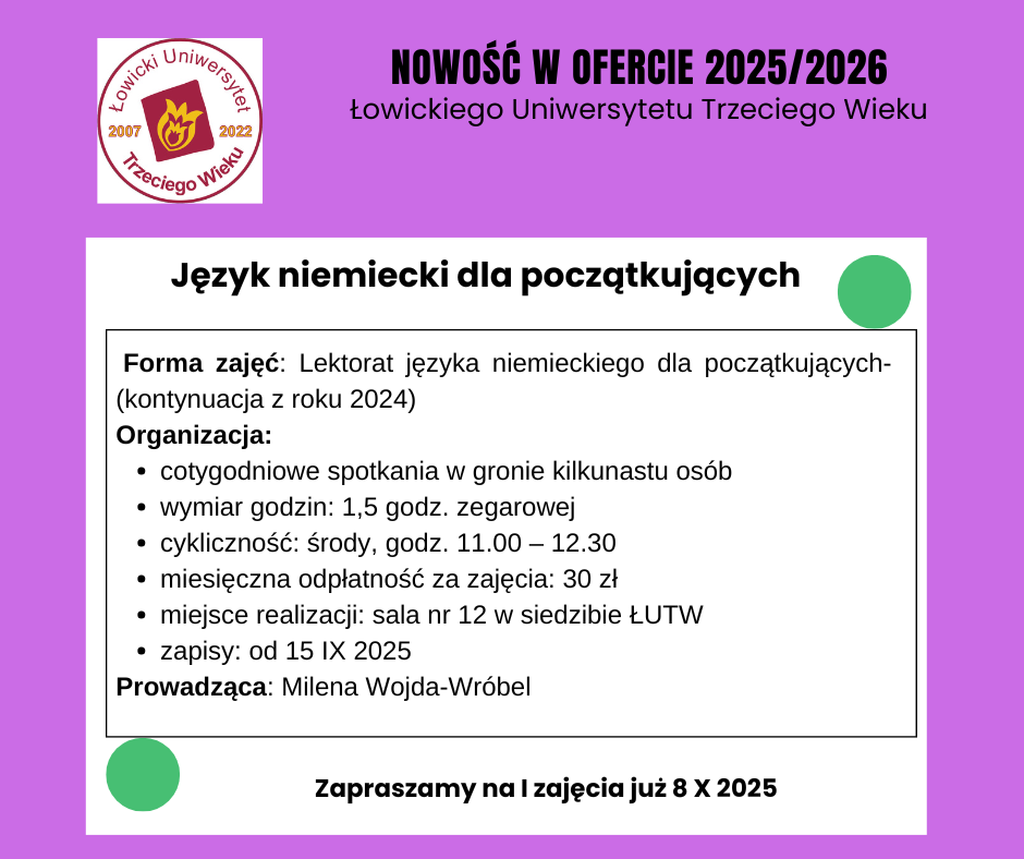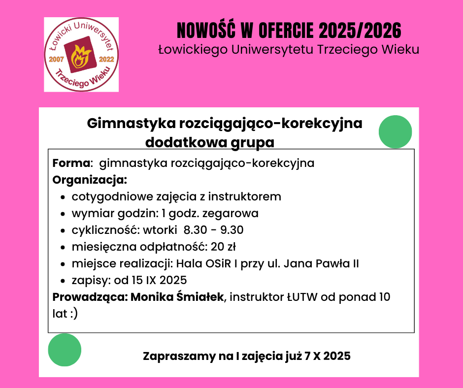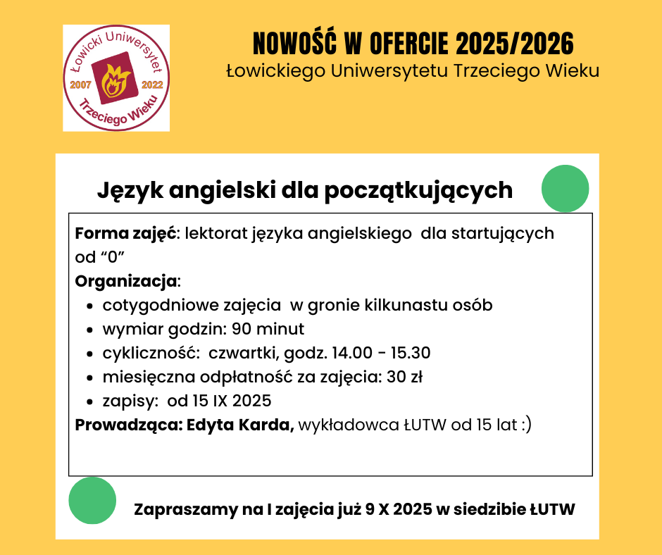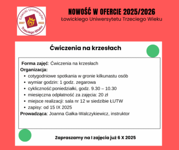Informujemy słuchaczy i kandydatów do Łowickiego Uniwersytetu Trzeciego Wieku, że od 15 IX 2025 r. można się zapisywać także na całkiem nowe zajęcia wprowadzone do planu na rok akademicki 2025/2026: