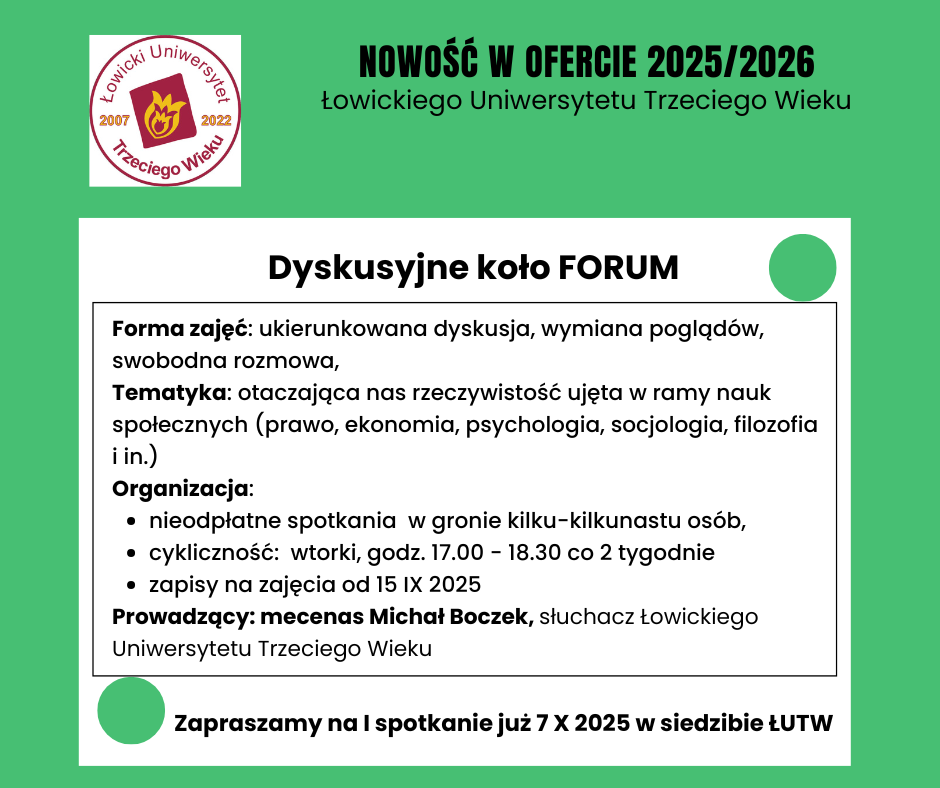 - Dyskusyjne koło FORUM – spotkania prowadzone w formie ukierunkowanej dyskusji, wymiany poglądów, swobodnej rozmowy na temat otaczającej rzeczywistości ujętej w ramy nauk społecznych (np. prawo, ekonomia, socjologia, filozofia); cykliczność: co 2 tygodnie we wtorki w godz. 17.00 – 18.30; zajęcia nieodpłatne; prowadzący: mec. Michał Boczek, słuchacz ŁUTW; pierwsze spotkanie: 7 X 2025 r.