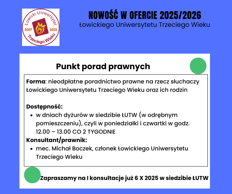 - Punkt porad prawnych – nieodpłatne porady świadczone na rzecz słuchaczy Łowickiego Uniwersytetu Trzeciego Wieku oraz ich rodzin przez mec. Michała Boczka, słuchacza ŁUTW; cykliczność: poniedziałki godz. 12.00 – 13.00; miejsce: sala nr 13 w siedzibie ŁUTW.