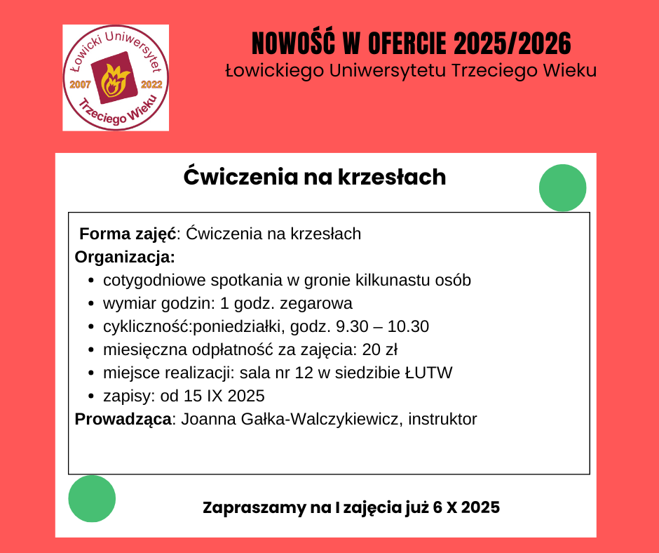 - Ćwiczenia na krzesłach; cykliczność: poniedziałki godz. 9.30 – 10.30; miesięczna odpłatność za zajęcia: 20 zł; miejsce realizacji: sala nr 12 w siedzibie ŁUTW; prowadząca: Joanna Gałka-Walczykiewicz;
