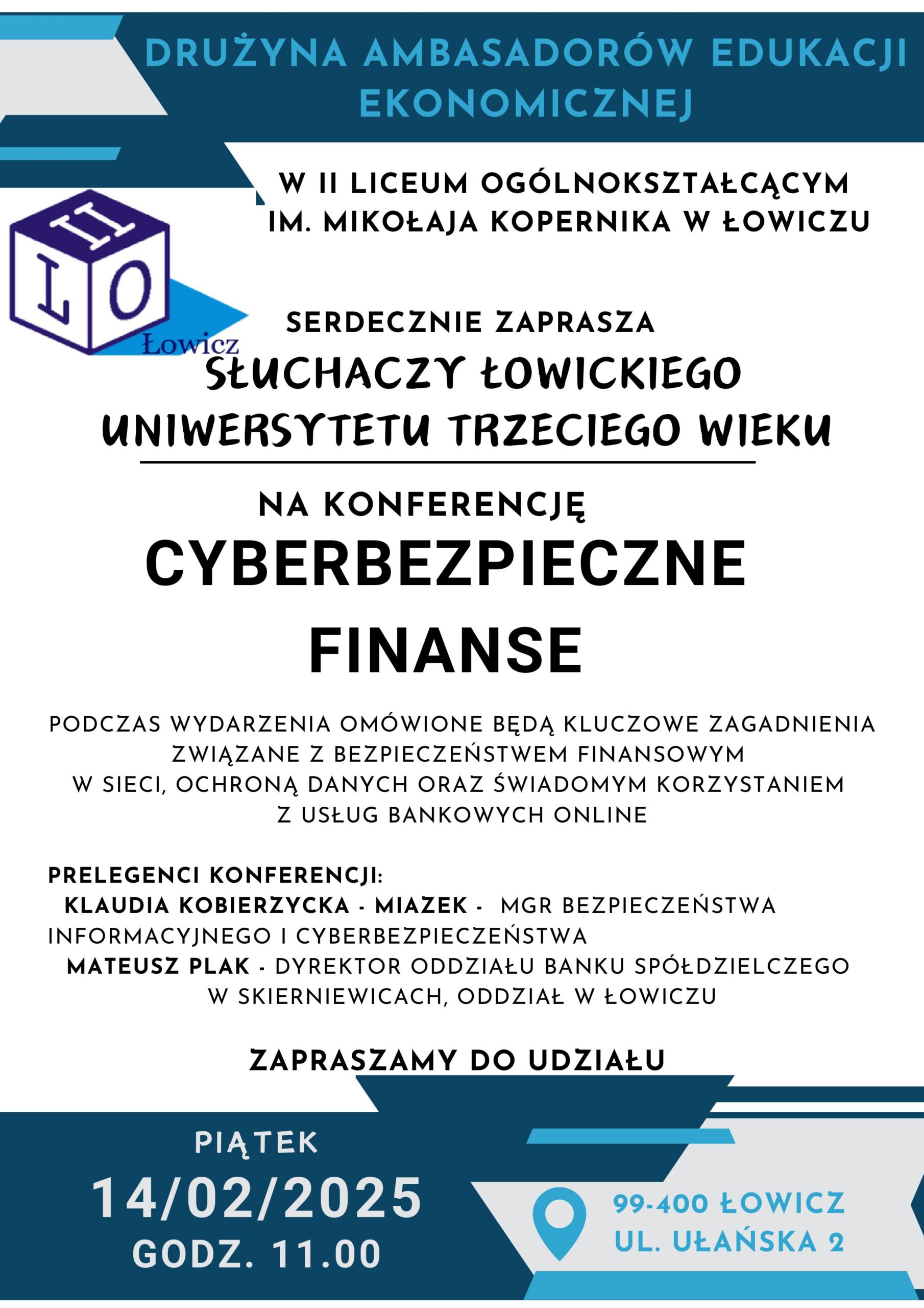 Na zaproszenie dyrektor Agnieszki Ruty-Kucińskiej oraz Drużyny Ambasadorów Edukacji Ekonomicznej w II Liceum Ogólnokształcącym im. Mikołaja Kopernika w Łowiczu grupa seniorów z Łowickiego Uniwersytetu Trzeciego Wieku wraz z przedstawicielami Klubu Seniora „Radość” i „Łowickich Amazonek” uczestniczyła w dn. 14 II 2025 r. w przygotowanej tam konferencji „Cyberbezpieczne finanse”.