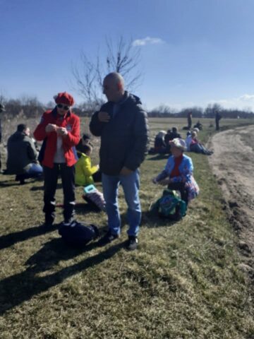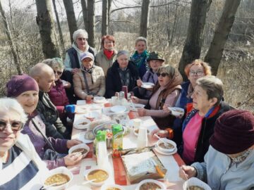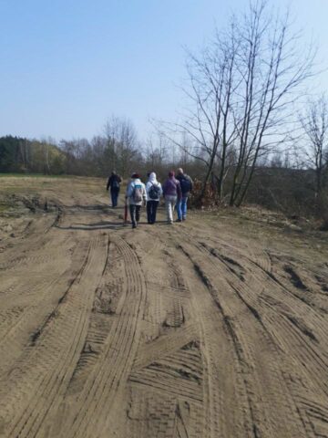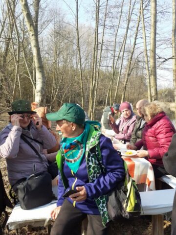 Dystanse ich spacerów w ramach „Na przełaj” są trochę krótsze, bo dostosowane do czasu (3 godziny), jakim dysponują pomiędzy kursami busa do Dąbkowic i z powrotem do Łowicza. Zwykle pokonują 6-8 km, a wędrująca grupa liczy średnio 12 osób. Jednak wyprawa 18 III była znacznie liczniejsza, bo zapowiedziany był… piknik w lesie. Urodzinowy gorący (Tak!) posiłek przygotowała solenizantka Danusia.