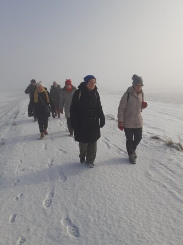 Spacer rozpoczęli w gęstej zimowej mgle spod kapliczki w Dąbkowicach Górnych… Na szczęście mieli ze sobą czujnego czworonożnego przewodnika, który chyba już dobrze zna wszystkie dąbkowickie ścieżki i nie pozwolił im zabłądzić. Mgła ustąpiła dopiero w okolicach Guźni. Potem, w nagrodę za wytrwałość, zaświeciło im słońce, które zaczarowało całą okolicę.