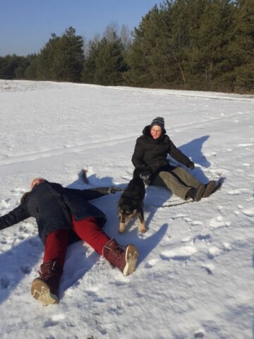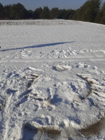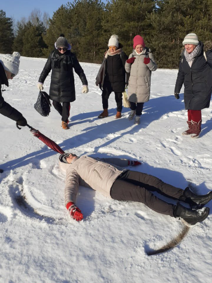 Podczas wyprawy szef grupy Ryszard Kolary wręczył wszystkim uczestnikom wędrówki nieco spóźniony prezent pod choinkę – ciepłe wełniane skarpety zakupione specjalnie dla grupy piechurów z „Na przełaj” w ramach wsparcia z projektu „Senior aktywny fizycznie” dotowanego w 2025 r. z budżetu Gminy Miasto Łowicz. No i właśnie z tej radości wywinęli orła na śniegu – ale takiego zaplanowanego! W ogóle byli bardzo kreatywni w tych śnieżnych zabawach.