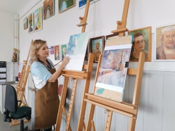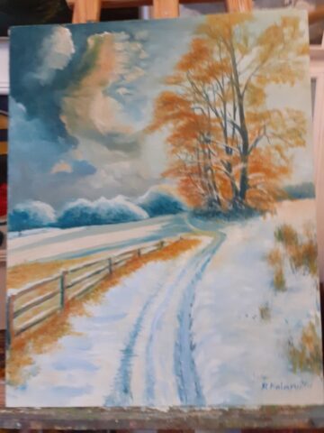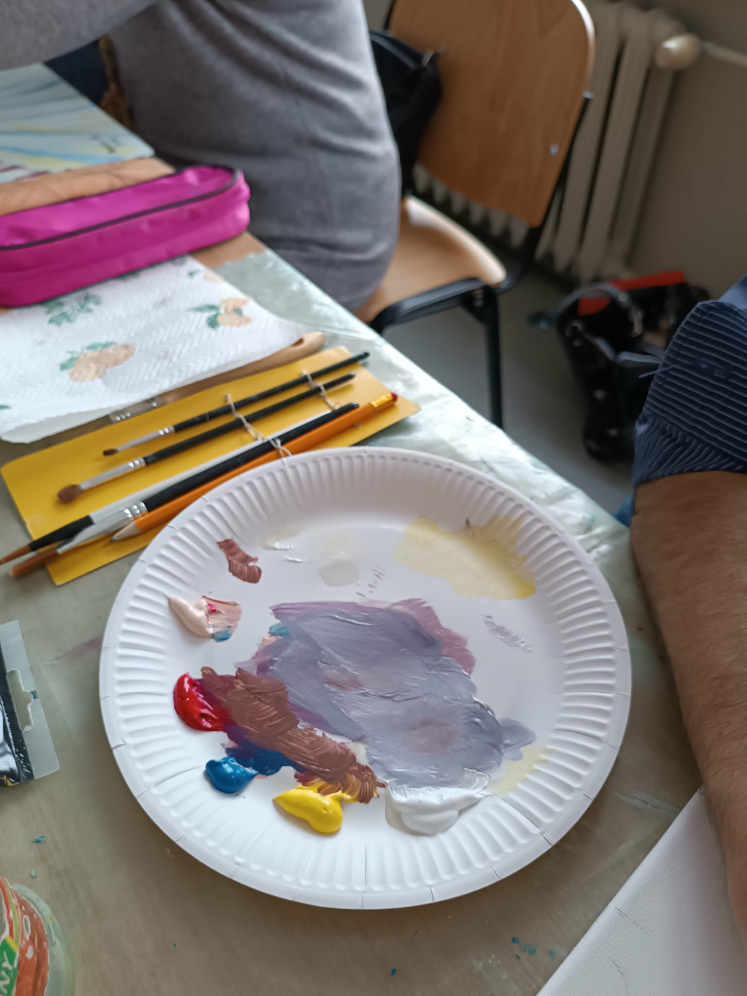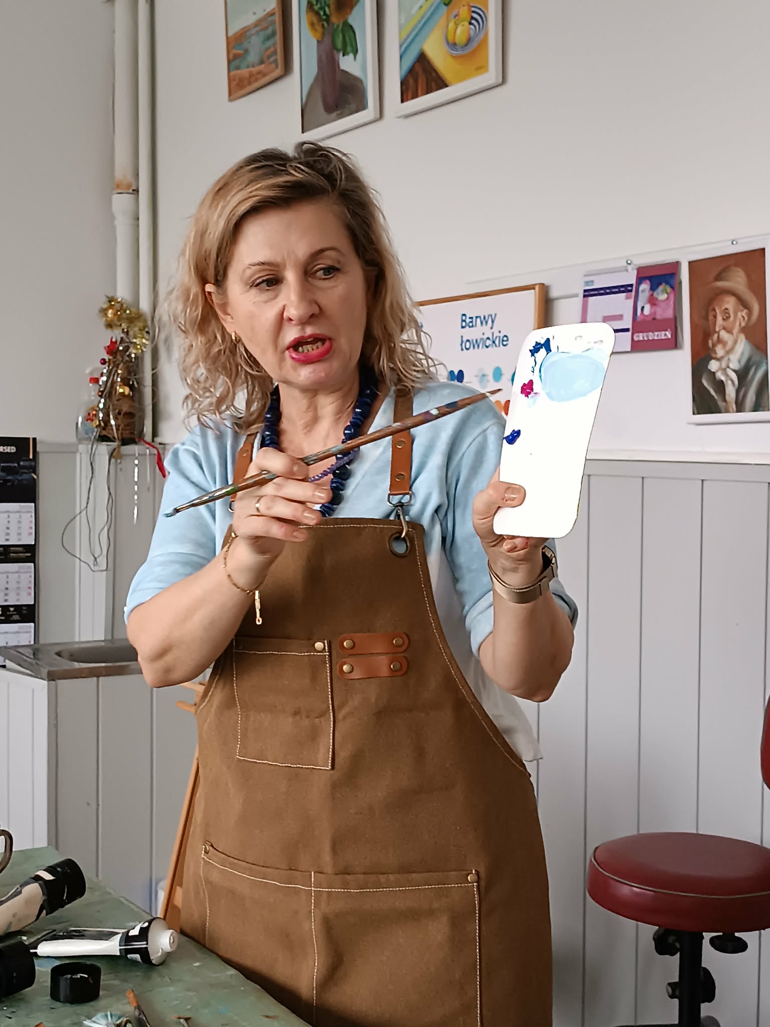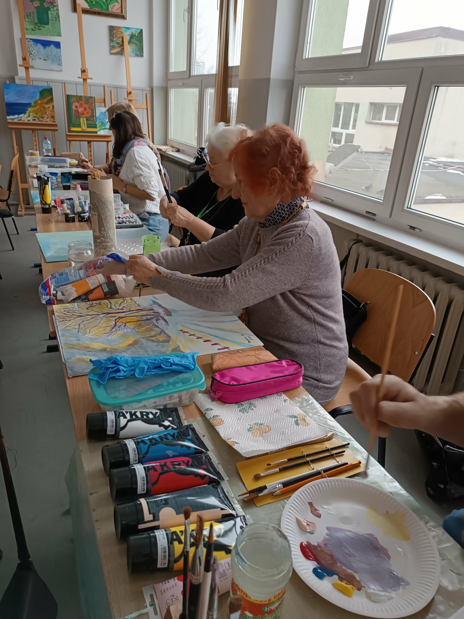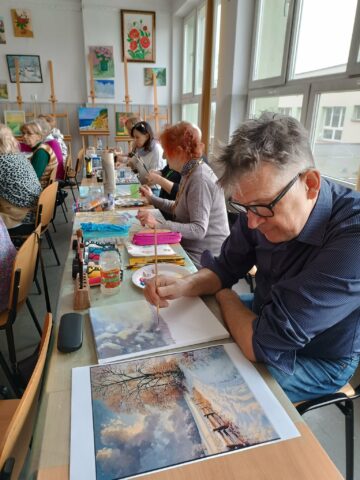 Bo śnieg, choć biały, czasami wydaje się niebieski - zwłaszcza w głębokich cieniach. I o tym było w teorii i praktyce podczas zajęć grupy plastycznej "Nowa Fala" na Łowickim Uniwersytecie Trzeciego Wieku z instruktorką Aldoną Zając - artystą plastykiem w dn. 16 I 2026 r.