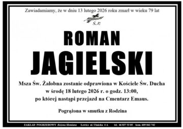 *Pogrzeb śp. Romana Jagielskiego odbędzie się w środę 18 II 2026 r. o godz. 13.00 w kościele Świętego Ducha w Łowiczu. Pochowany zostanie na cmentarzu Emaus w Łowiczu.