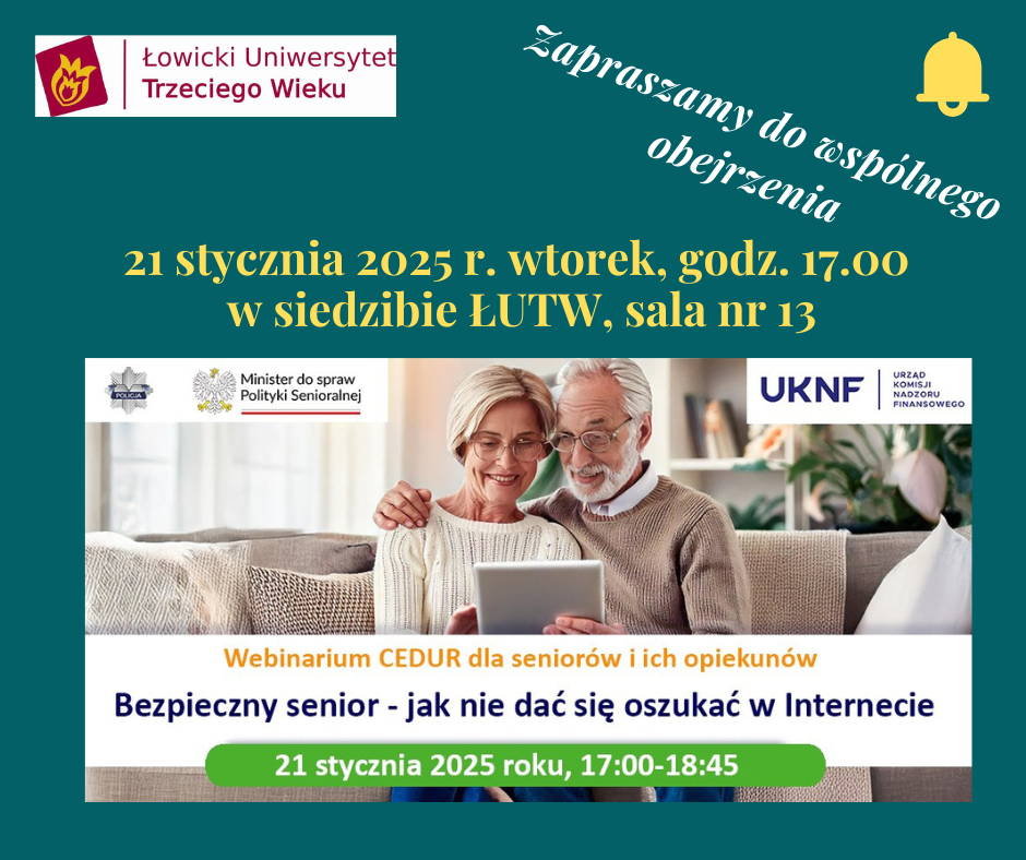 - 21 I 2025 (wtorek) godz. 17.00 – „Bezpieczny senior – jak nie dać się oszukać w Internecie” - zapraszamy do wspólnego (grupowego) uczestniczenia - przy kawie lub herbacie - w bezpłatnym webinarium (spotkaniu online) we wtorek 21 stycznia 2025 r.