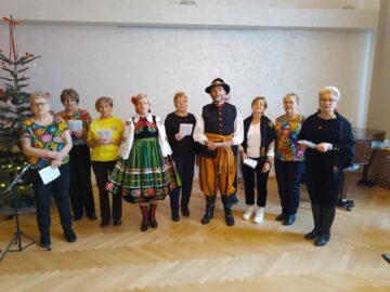 Prezes Krystyna Kucharska wręczyła przywiezione z Polski prezenty: piękne wycinanki od twórczyń ludowych, kartki świąteczne wykonane przez łowickie seniorki na warsztatach rękodzieła oraz wiele regionalnych pamiątek podarowanych przez Burmistrza Miasta Łowicza Mariusza Siewierę.