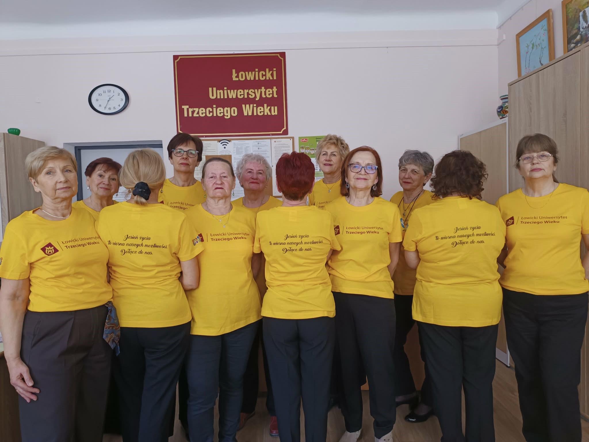 Z satysfakcją tego dnia załoga biura ŁUTW oficjalnie zaprezentowała nowe firmowe koszulki. Pięknie się będą w nich prezentować słuchacze na różnych specjalnych wydarzeniach, promując stowarzyszenie. Z jaką radością wszystkie koleżanki pozowały w nich do zdjęcia, a z jeszcze większą tak wystrojone zapukały do biura Referatu Współpracy, aby pracującym tam paniom z Urzędu Miejskiego złożyć świąteczne życzenia.