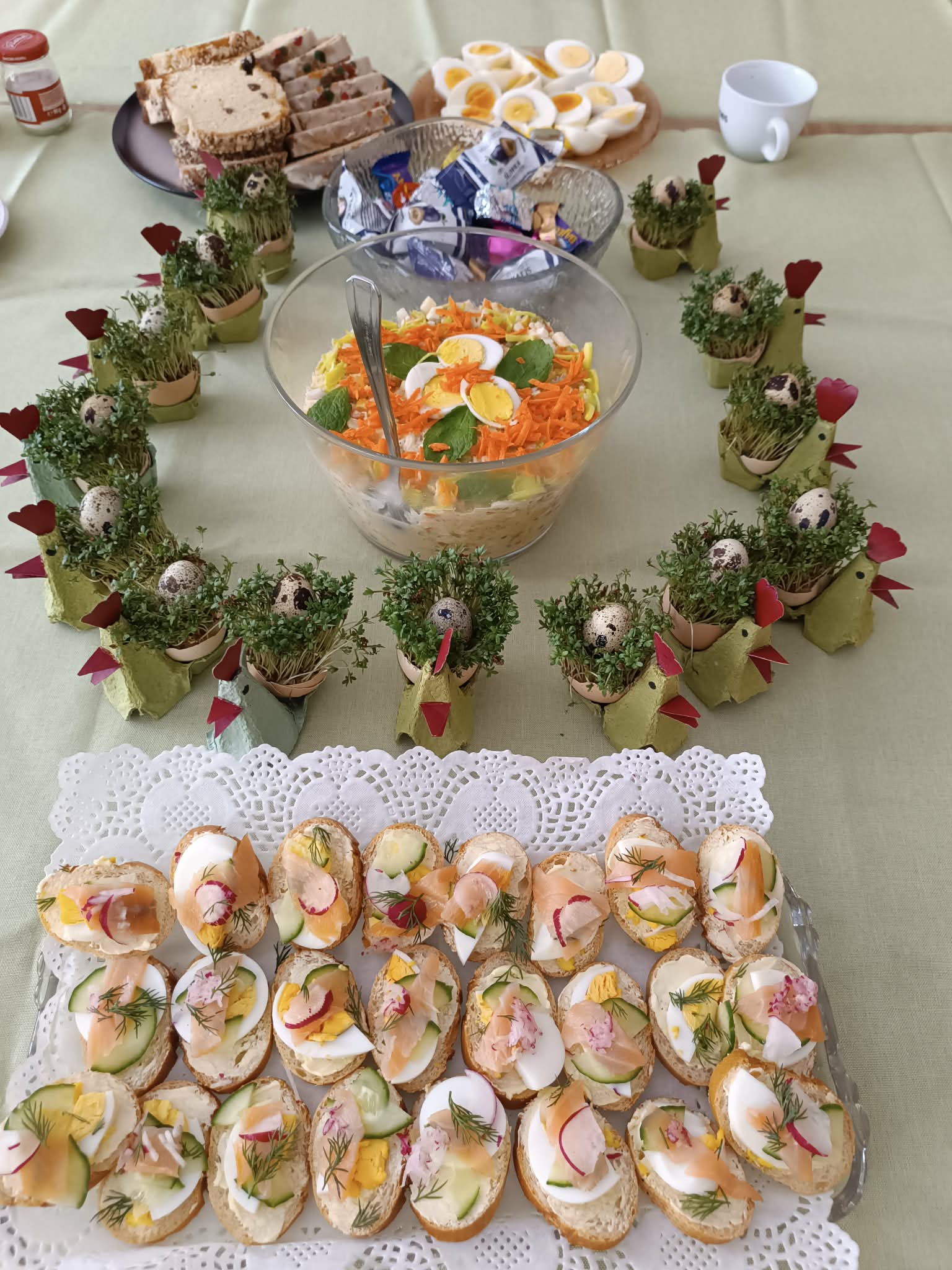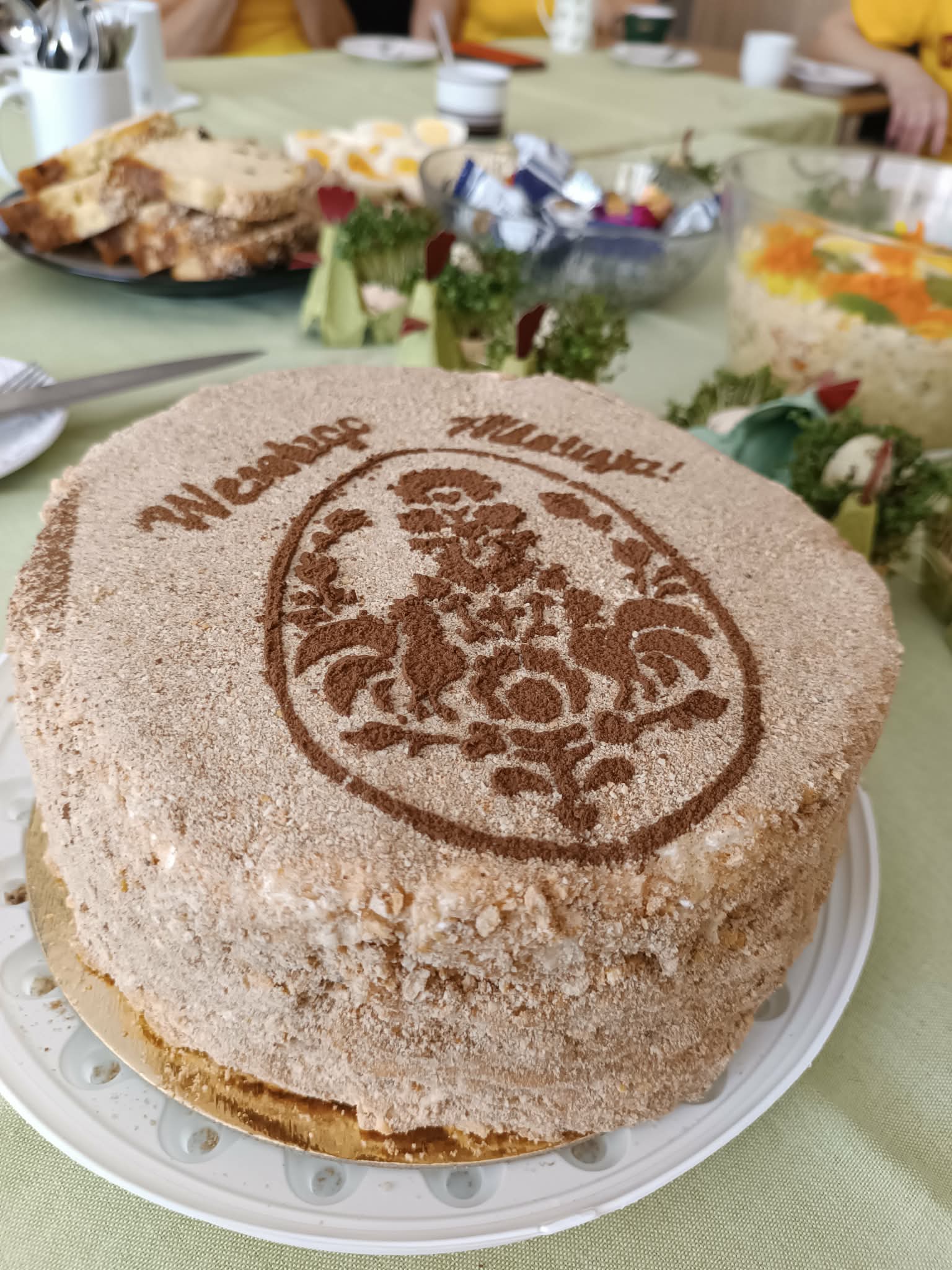 No właśnie – życzenia. Ten ostatni przed Wielkanocą dyżur w biurze to była też okazja i do złożenia życzeń świątecznych w gronie prawie wszystkich jego pracowników (społecznych), i do podziękowań za poświęcanie czasu dla zapewnienia przyjemnego i efektywnego funkcjonowania tego miejsca, co uczyniła prezes Krystyna Kucharska. Z krótkiego hasła „Przynosimy po jednym jajku”, zrobił się piękny świąteczny stół, przy którym było miło porozmawiać, skosztować pyszności , napić się herbaty.