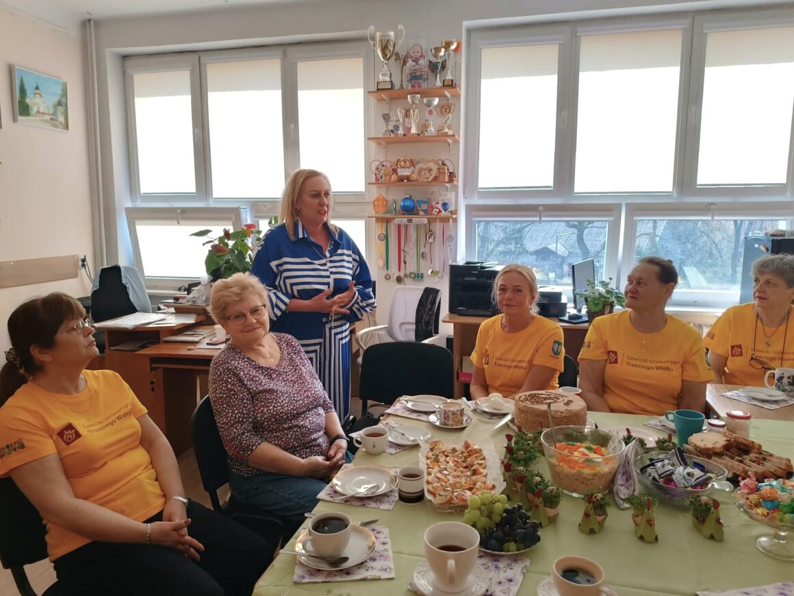 Tego dnia pojawiła się też w biurze Monika Śmiałek – instruktorka gimnastyki, która po kilkunastu latach prowadzenia zajęć dla seniorów z Łowickiego Uniwersytetu Trzeciego Wieku, podjęła decyzję o zakończeniu współpracy. Choć to było już ostateczne pożegnanie, ale w bardzo radosnej atmosferze. A tort, który przyniosła, nie dość, że był przepyszny, to jeszcze taki świąteczny, aż żal było go napoczynać. Dziękujemy Droga Moniko, za super współpracę.