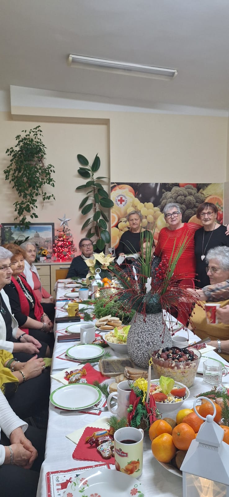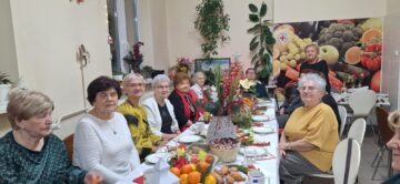 Tradycyjnie w piątkowe popołudnie, 12 XII 2025 r., uczestniczki tego koła uprawiały sztukę – kulinarną, oczywiście i, oczywiście, pod kierunkiem Marii Jagodzińskiej. Na pięknie zaaranżowanym stole ustawiono półmiski i salaterki z przygotowanymi potrawami, na których były wspominane pierogi, ale też śledzie w majonezie z cebulką i ogórkiem, sałatka z ananasem i sałatka z tuńczykiem.