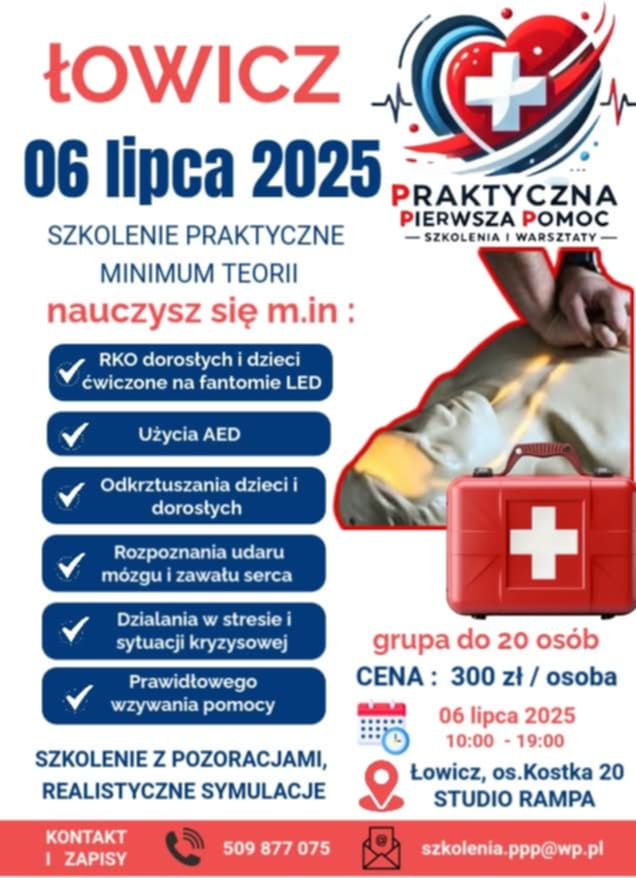 Szkolenie odbędzie się w niedzielę 6 VII 2025 r. w godz. 10.00 – 19.00 w Studio Rampa na os. Kostka bl. 20 w Łowiczu. W kameralnej grupie poprowadzi je 4 instruktorów z dużym doświadczeniem w ratownictwie.