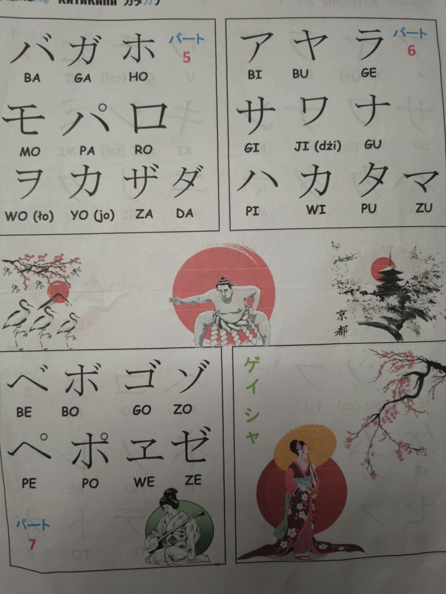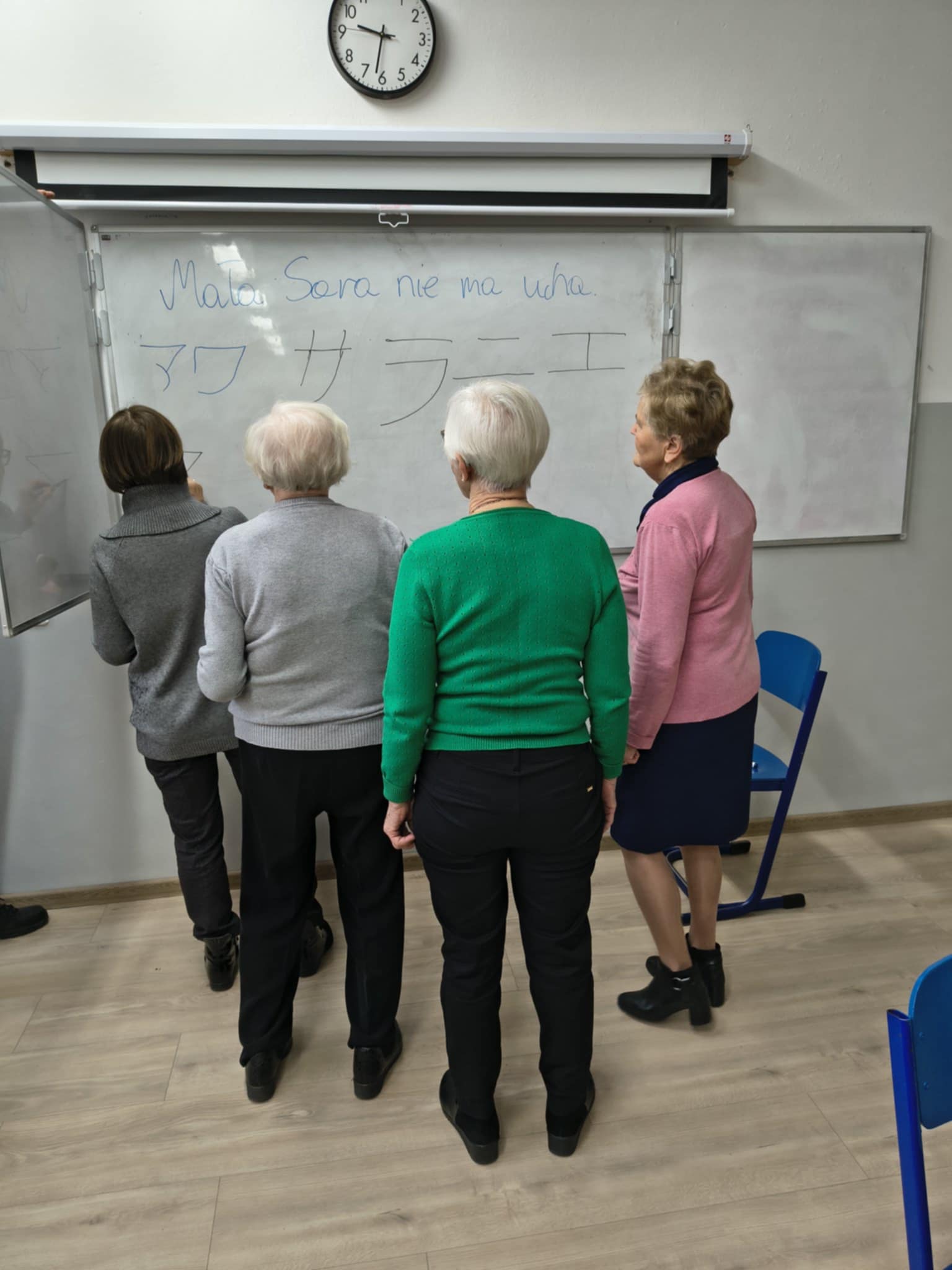 Na ostatnich przedświątecznych zajęciach (18 XII 2025), kiedy jednak święta jeszcze całkiem nie zawróciły im w głowach, ćwiczyli katakanę (alfabet japoński). Katakana spotkała się z niezwykłą bystrością umysłu łowickich studentów-seniorów i dzięki temu zdania były tłumaczone w mig, a konkurencja przy tablicy była przy tym ogromna.