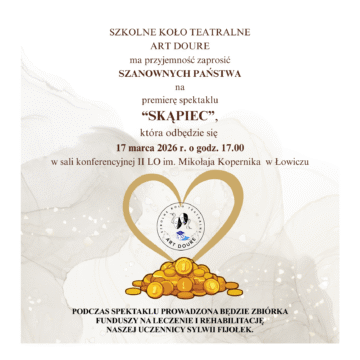 Szkolne Koło teatralne ART DOURE z II Liceum Ogólnokształcącego im. Mikołaja Kopernika w Łowiczu zaprasza społeczność Łowickiego Uniwersytetu Trzeciego Wieku na premierę spektaklu pt. „Skąpiec” , która odbędzie się we wtorek 17 marca o godz. 17.00 w sali konferencyjnej II LO przy ul. Ułańskiej.