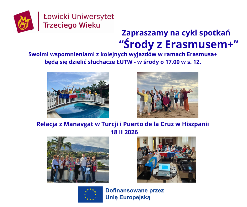 Zapraszamy na I spotkanie z cyklu „Środy z Erasmusem+” w środę 18 II 2026 r. o godz. 17.00 do sali nr 12 Łowickiego Uniwersytetu Trzeciego Wieku, na którym uczestniczki 2 dotychczasowych międzynarodowych kursów dla kadry zarządzającej i dydaktycznej ŁUTW podzielą się swoimi wrażeniami i przybliżą istotę takich szkoleń.