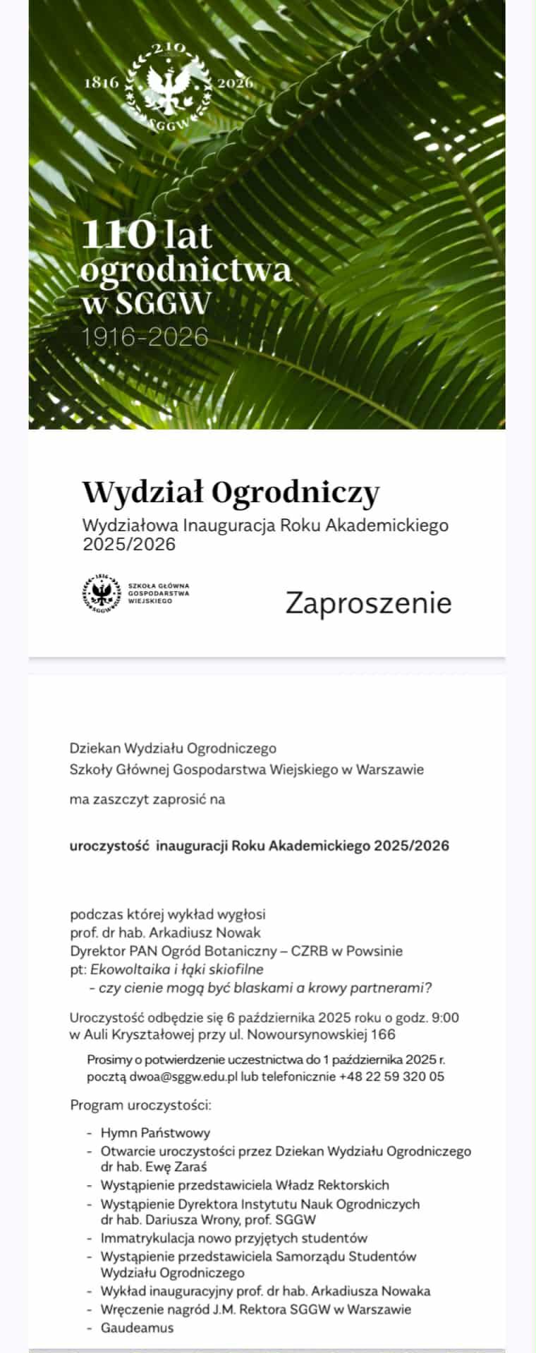 ✅ Zaproszenie z SGGW w Warszawie na inaugurację roku akademickiego 2025/2026