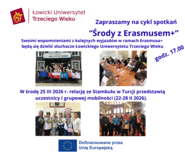 Zapraszamy słuchaczy Łowickiego Uniwersytetu Trzeciego Wieku, i inne osoby zainteresowane, na II spotkanie z cyklu „Środy z Erasmusem+” w środę 25 III 2026 r. o godz. 17.00 w s. 13 siedziby ŁUTW.