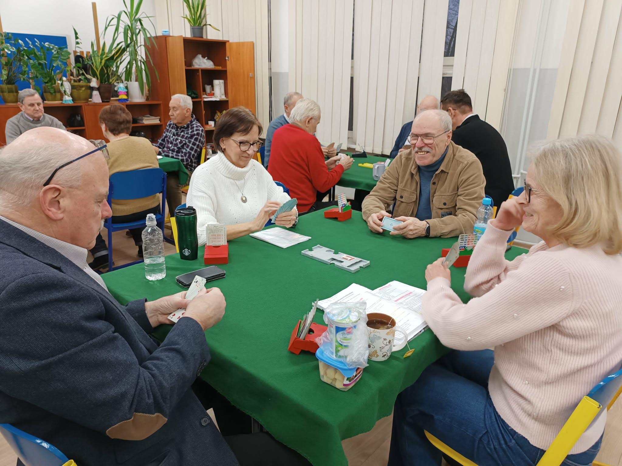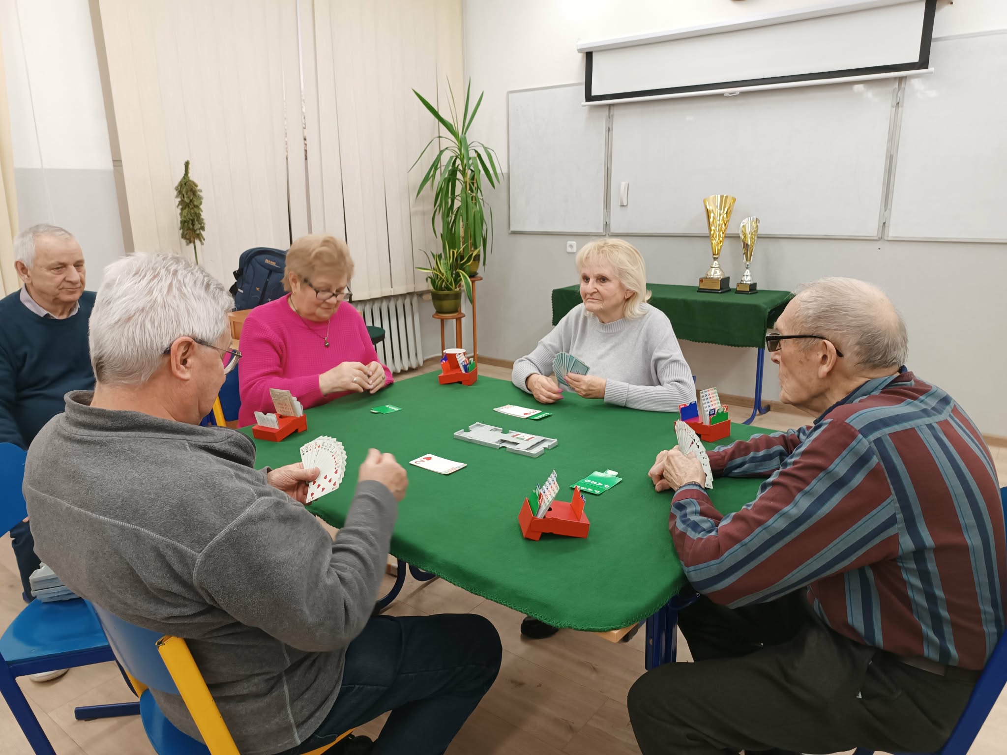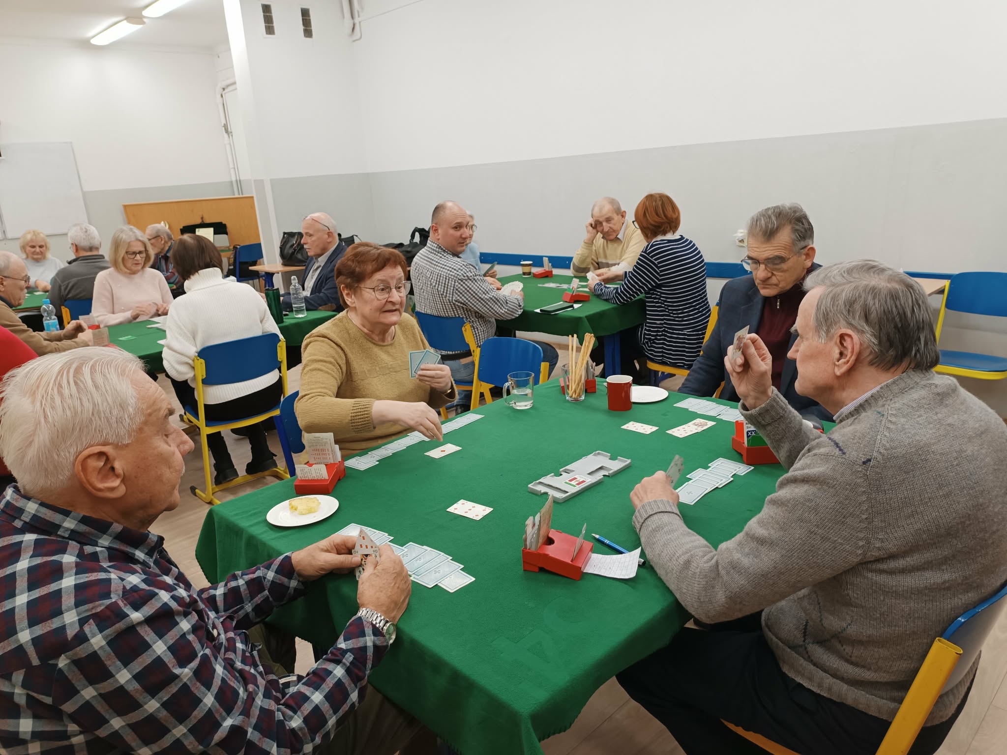 Nie mogło być inaczej – po tej uroczystej chwili nastąpiła brydżowa „codzienność”. Przy 5 zielonych stolikach tradycyjnie rozegnano środową partię brydża.